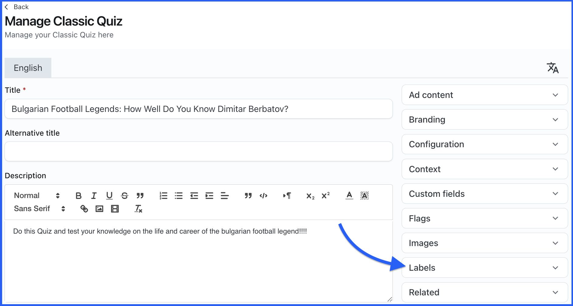 - In the quiz management screen, scroll down to find the Labels section on the right side