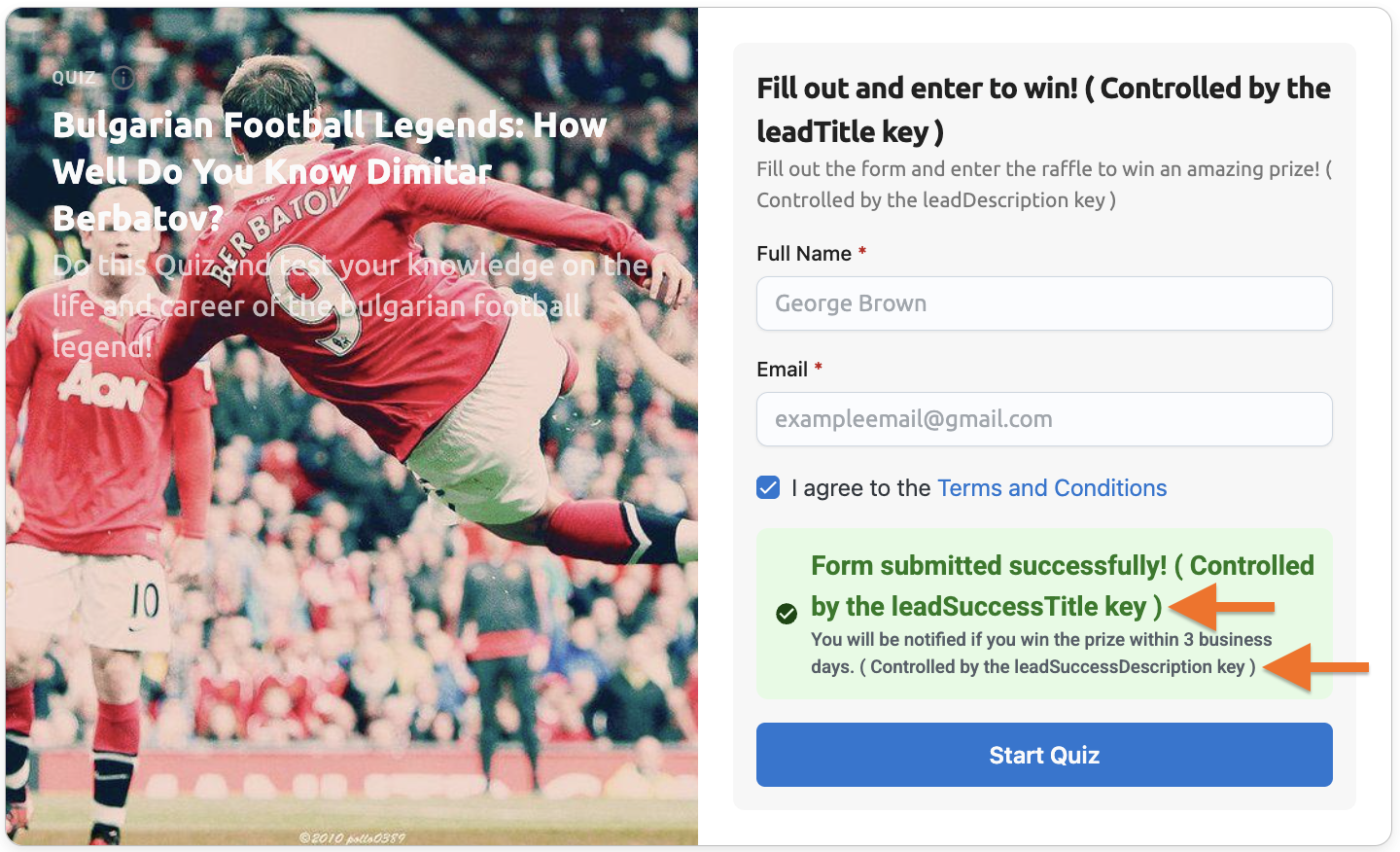 - Your leadSuccessDescription appears as the success message description