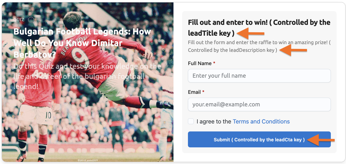 Classic Quiz widgets (or any other widget) with lead forms (authRequirement = lead) display default text for the 1) lead form title, 2) description, 3) button label and, upon submission, 4) success message title and 5) success message description. If you want to customize any of these five text elements, you need to configure them using the Labels feature in the Management Portal.