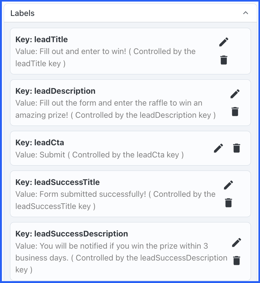 The image below shows the Labels section in the Management Portal with all five lead form labels configured. These are the exact label settings used in the quiz widget examples shown in this article.