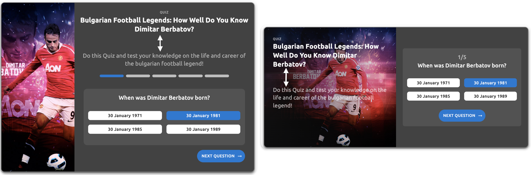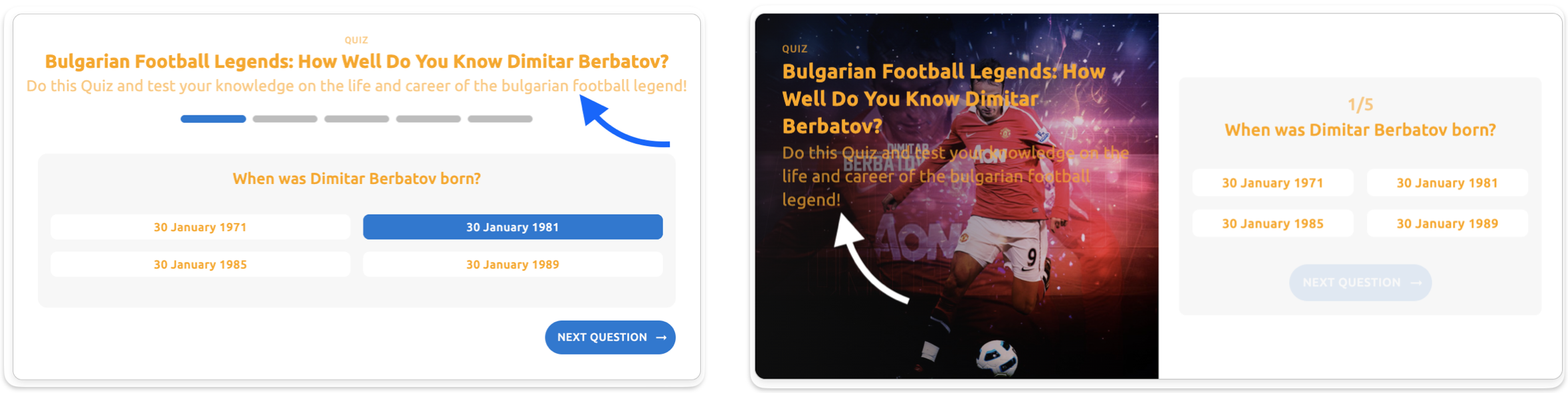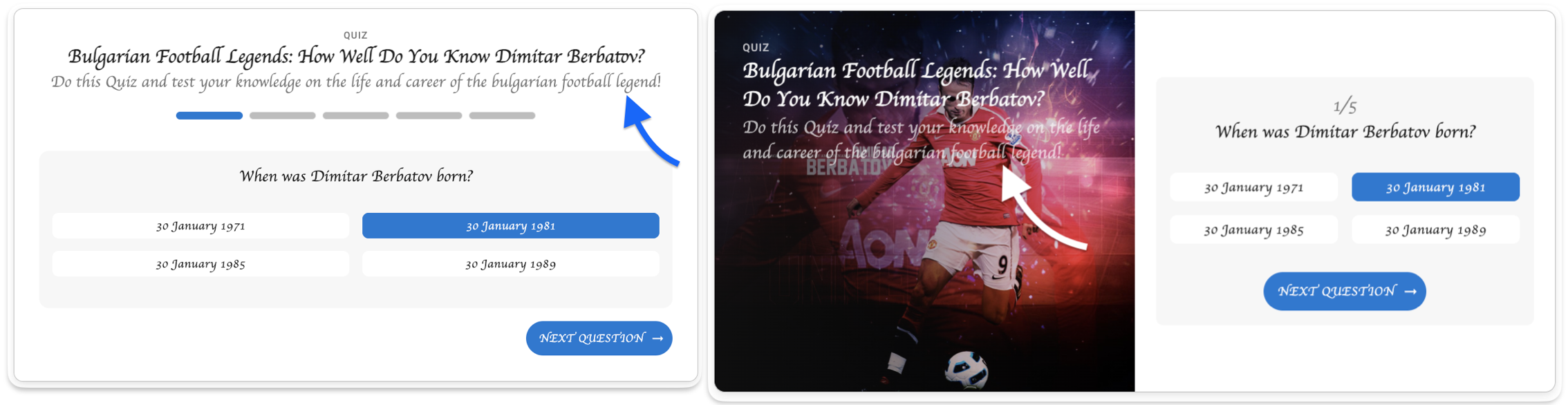 The screenshots below demonstrate the 3xs spacing token (increased from the default 2px for demonstration) controlling the vertical gap between the Quiz Title ("Bulgarian Football Legends: How Well Do You Know Dimitar Berbatov?") and the Description text in the Header element. The arrows indicate where this spacing is applied.