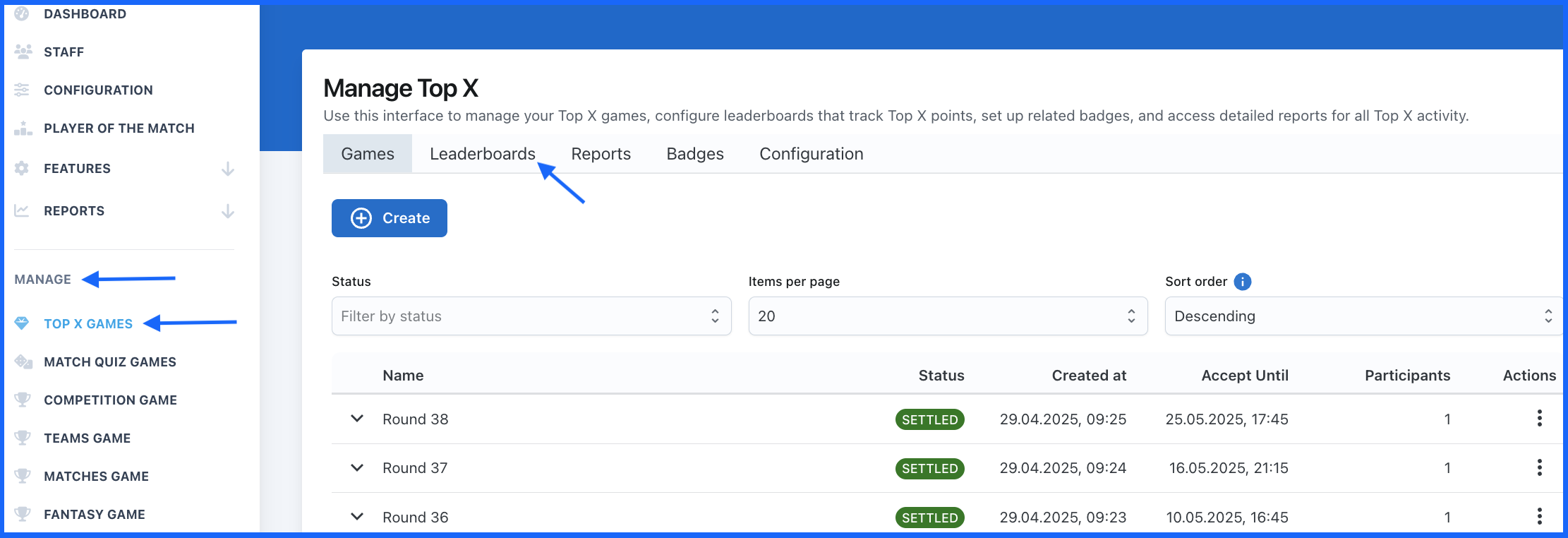 - Click on the Leaderboards tab located at the top of the Top X management interface (next to Games, Reports, Badges and Configuration)