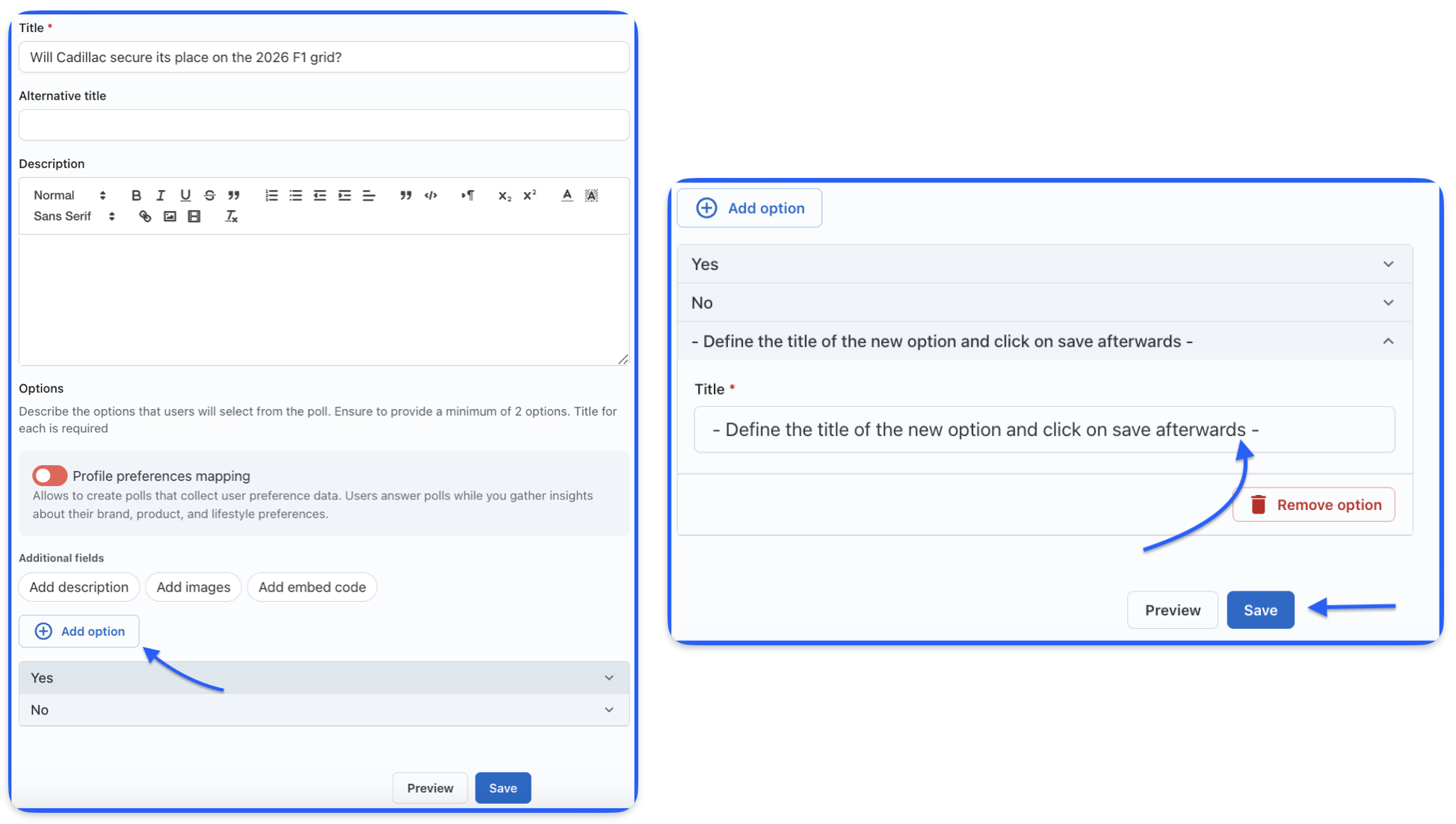 - Title: The only required element for each option - a clear, concise label that represents the choice (e.g., if your poll asks "Do you think Manchester United performed as well as they could have?", your option titles could simply be "Yes" and "No")
