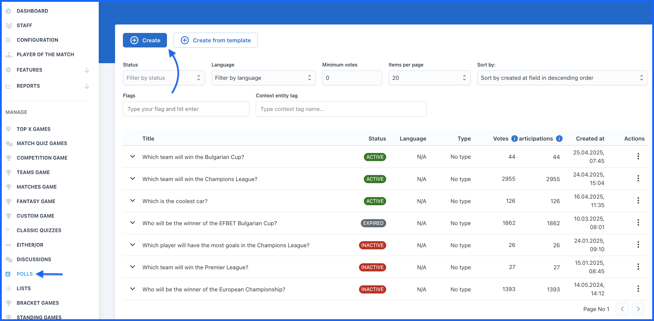 - Click the blue Create button located at the top of the Polls management page