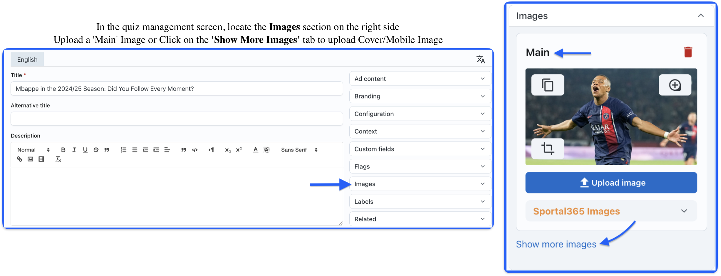 - Click on Show more images to reveal the Cover image field (or mobile image field)
