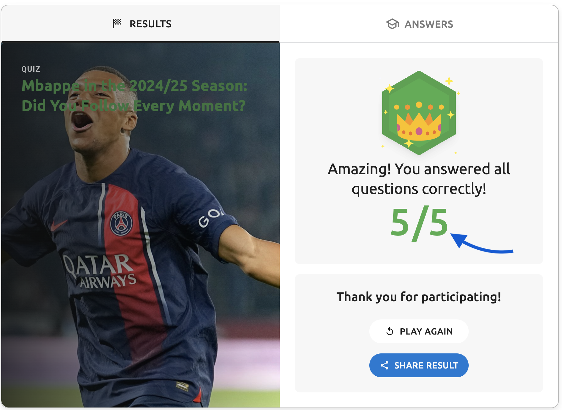 - Final score - The score display (e.g., "5/5") shown on the results screen