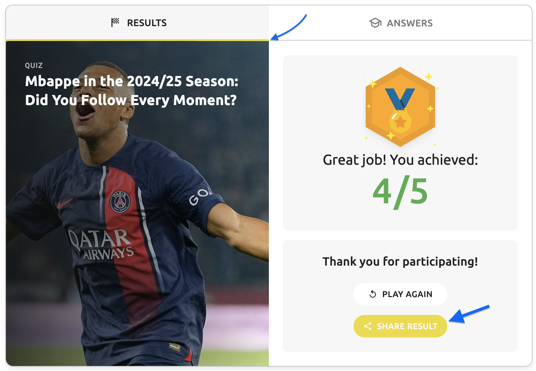 - Share Result button - The button on the results screen that encourages users to share their quiz results
