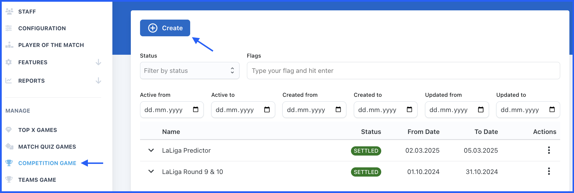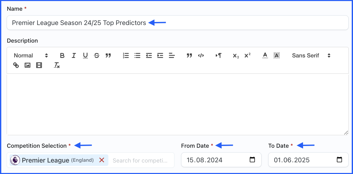 You must set both start and end dates ('from' and 'to' dates) to define the exact period your Competition Game will cover. These dates determine which predictions for the selected competition will fall within and count for the leaderboard.
