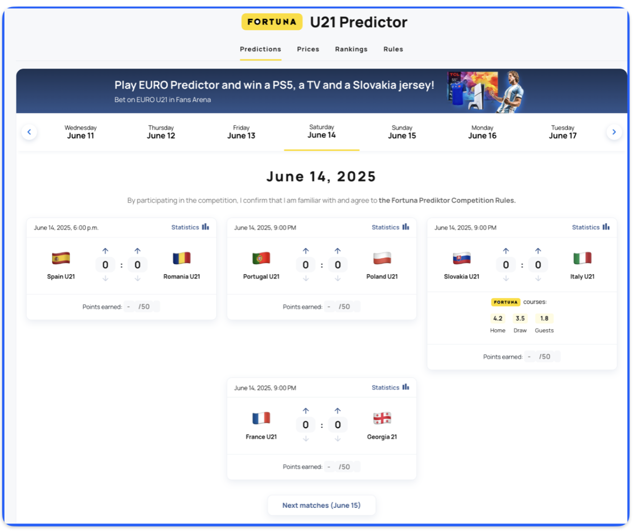 Example of a EURO U21 Predictor in action: Users navigate through match days, place predictions on pre-configured markets (Correct score), and track their points - while promotional prizes keep engagement high!