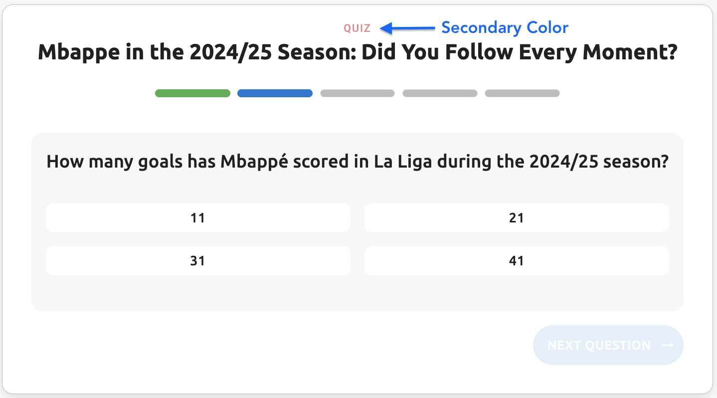 • Primary Color - Progress bars color, selected answer options color, main action buttons color ('Next Question' and 'Share result' buttons)