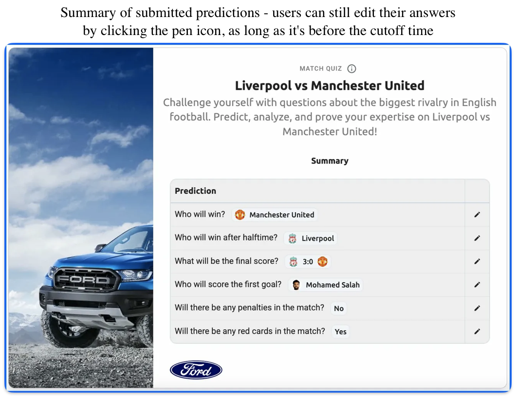 Widgets are ready-to-use UI components that bring our sports gamification features to life on your platform with minimal development work. Think of them as plug-and-play solutions that handle both the functionality and the user interface, so you can focus on your core business instead of building match quiz interfaces from scratch.