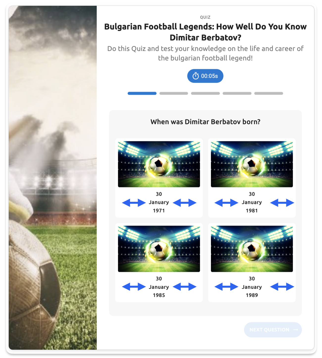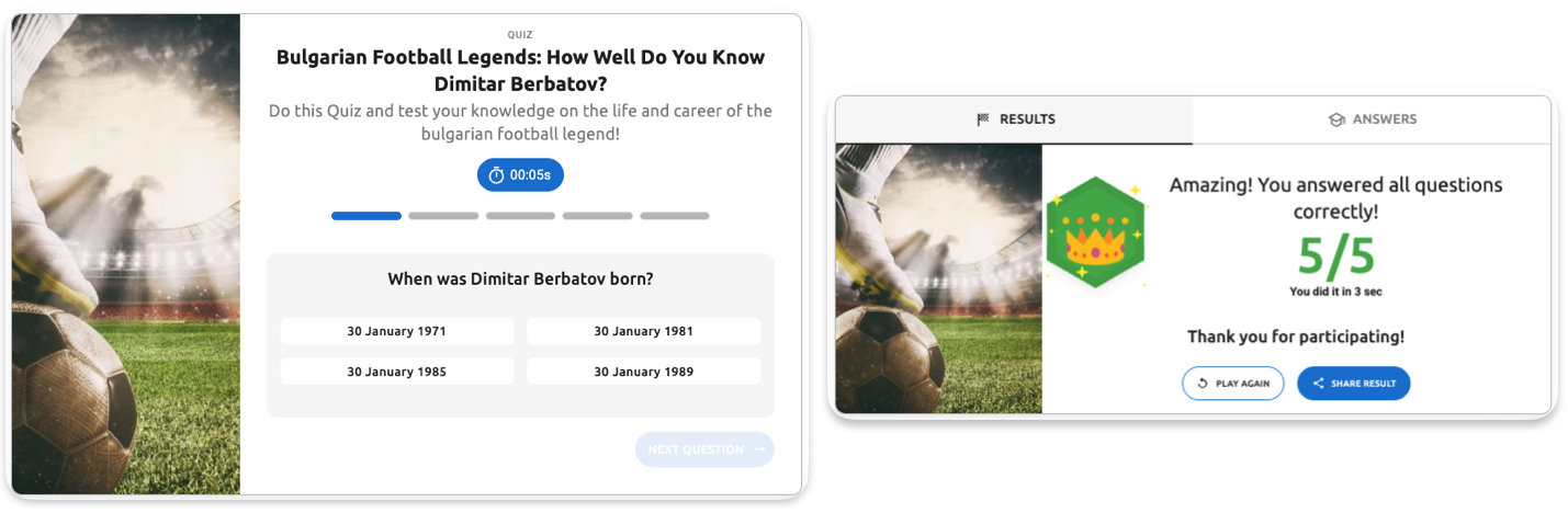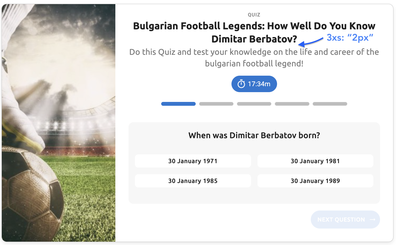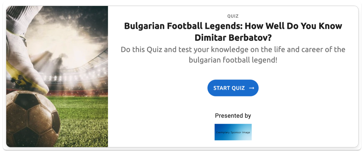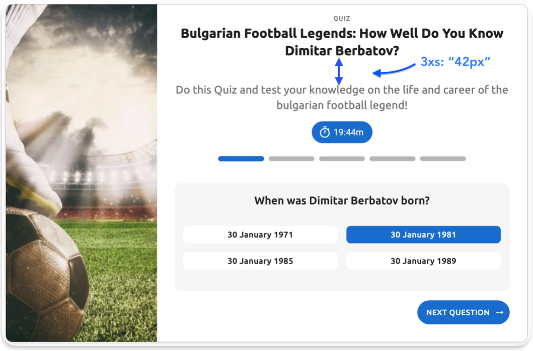 Standard template quiz with default 3xs spacing (2px) - controls the minimal gap between the quiz title "Bulgarian Football Legends: How Well Do You Know Dimitar Berbatov?" and the description text below it