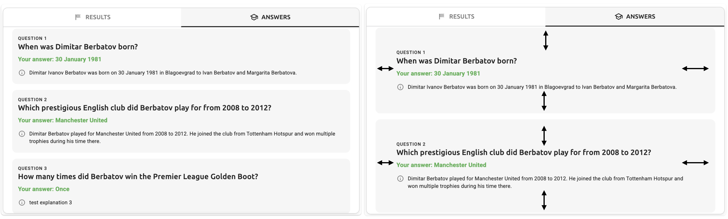 - Answers screen card padding - The internal padding within each individual answer card container on the Answers tab (containing question number, question text, user's answer, and explanation)