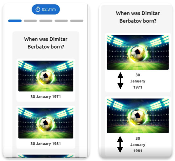 Standard template quiz showing answer options with images - the 2xs spacing (default 4px) controls the horizontal padding for the answer text labels (e.g., "30 January 1971", "30 January 1981")