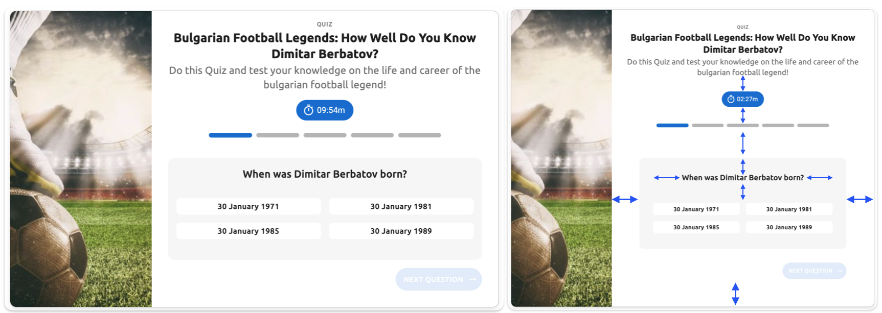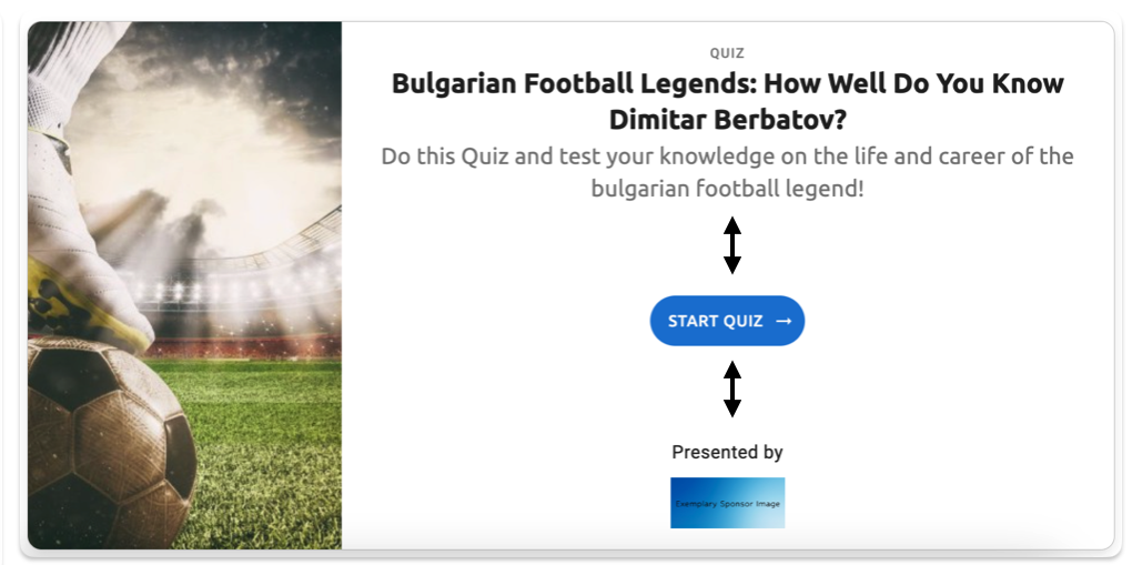 - Gap between title and description - The vertical spacing between the quiz title (e.g., "Bulgarian Football Legends: How Well Do You Know Dimitar Berbatov?") and the description text below it (e.g., "Do this Quiz and test your knowledge on the life and career of the bulgarian football legend!")