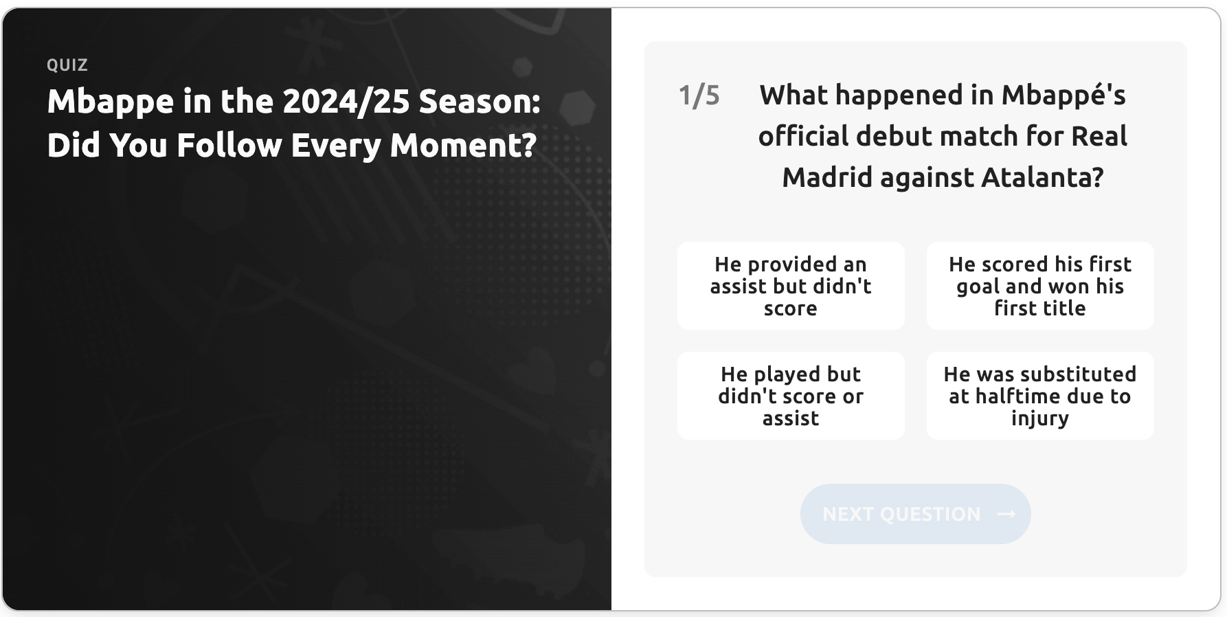 Our Quiz widget offers three different template layouts: Standard, Split and Overlay. The Split template uses a distinctive two-panel layout with visual content on the left and interactive quiz elements on the right.