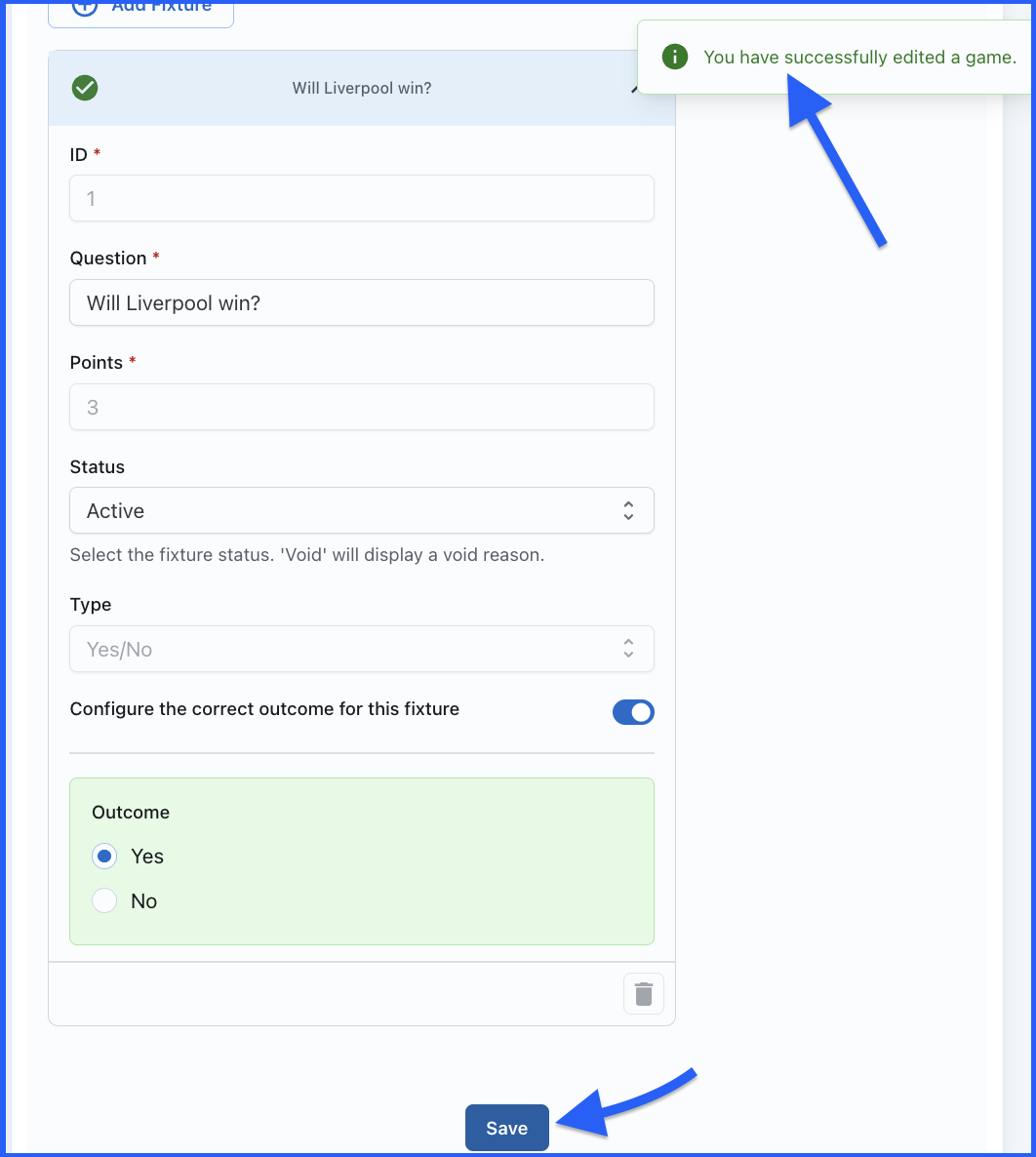 Yes, absolutely! After entering all the correct outcomes for your fixtures, you must scroll down and click the Save button to ensure your outcomes are saved in the system.