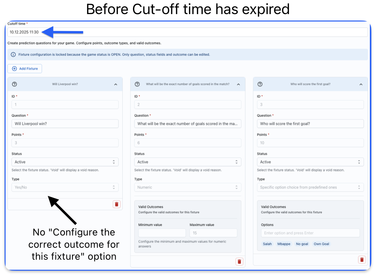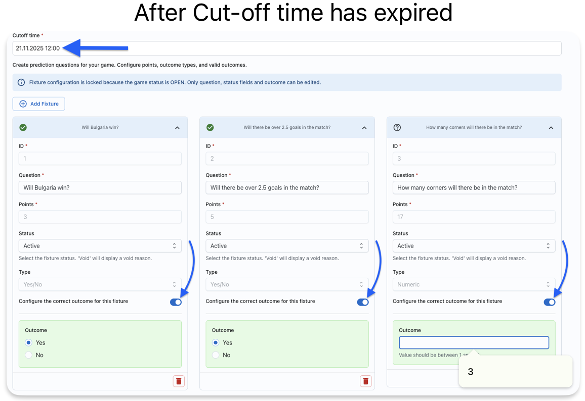 After the cutoff time has expired (meaning the cutoff time is now in the past), a new field will automatically appear for each fixture: "Configure the correct outcome for this fixture"