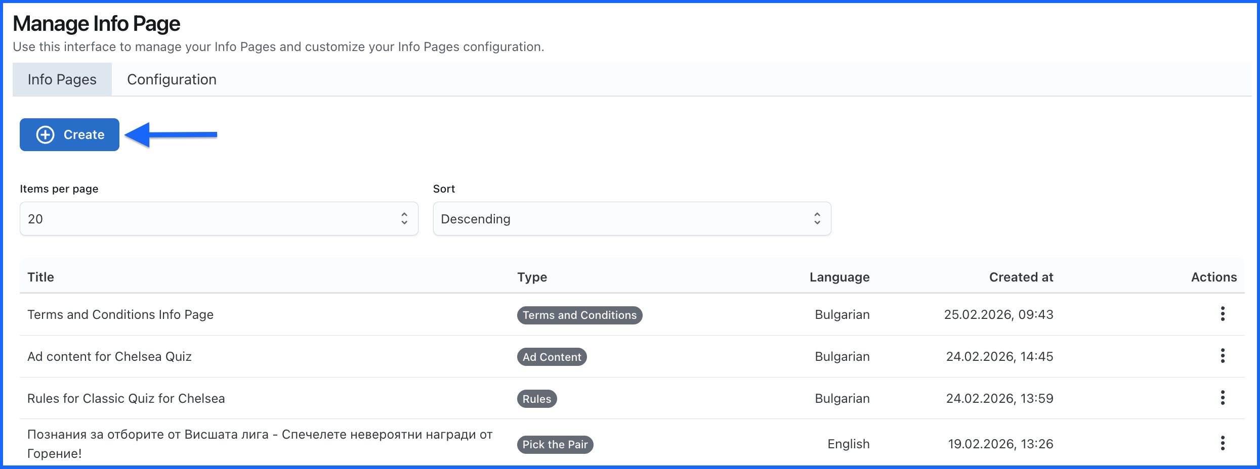 Step 3: Create Your Info Page: Return to the Info Pages tab and click Create. Enter a clear, descriptive title and select the appropriate type from the dropdown.