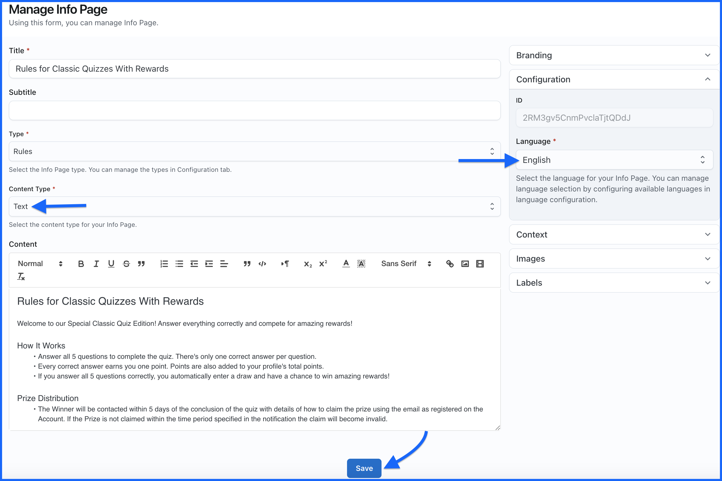 - Language (mandatory, can be configured from the 'Configuration' tab) β select the language for this Info Page. If the dropdown is empty, it means you haven't configured any languages yet. To do so, navigate to Configuration β Language.
