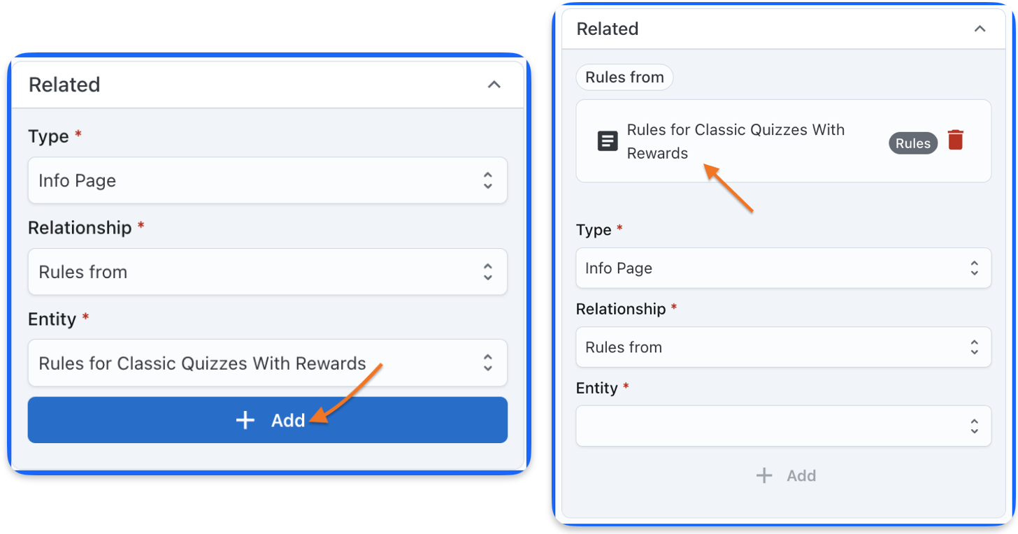 Step 7: Apply It to a Game (Way 2 β Related Section): Alternatively, in the Related section of any game's editing page, set the Type to Info Page, choose the correct Relationship (Rules from or Ad content from), select your Entity, and click + Add. (Requires SDK v1.123.0+) Scroll down and save the game.