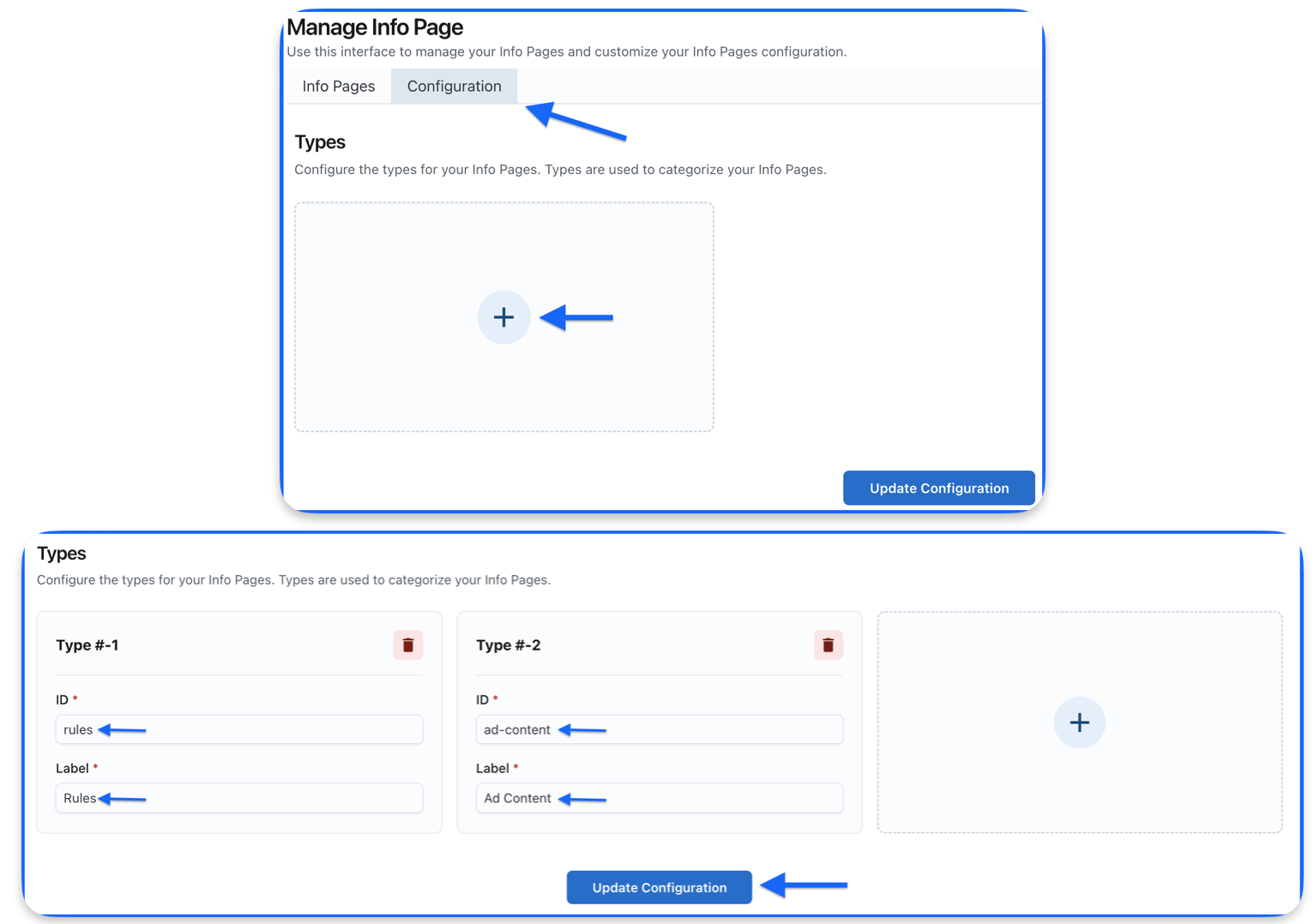 Step 2: Add Your Types: Click the + button to add a new type. Create two types: one with the ID rules and one with the ID ad-content. Click Update Configuration to save.