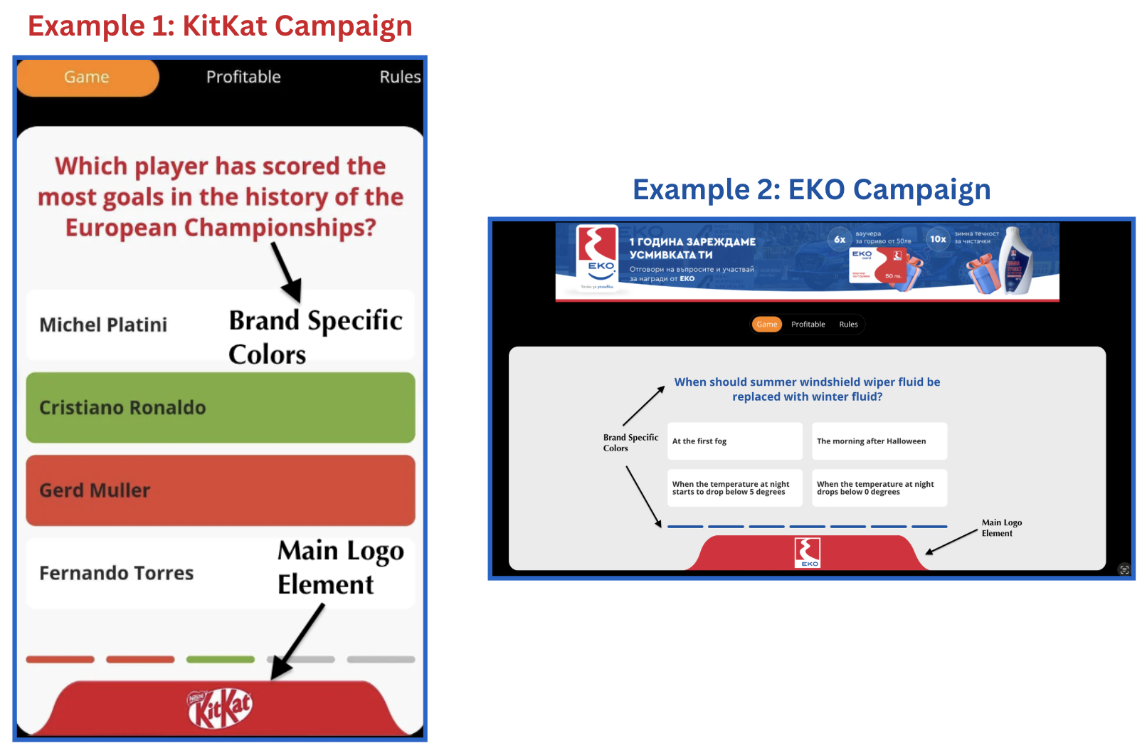 Branded vs. Non-Branded Quiz: Compare the branded KitKat and EKO quizzes (with custom logo elements and brand colors) to a standard non-branded quiz from the same platform (clean, functional design with basic styling). The difference showcases how branding elements transform the user experience.
