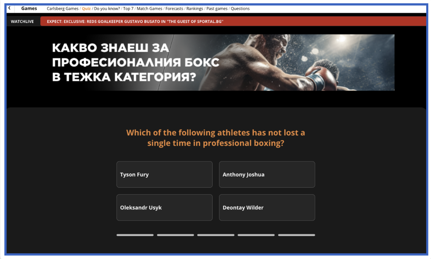 A leading Bulgarian sports media site running interactive quiz campaigns for their audience. They have a dedicated quiz page on their site where all quizzes are displayed, and they sometimes also embed quizzes within relevant articles for contextual engagement.