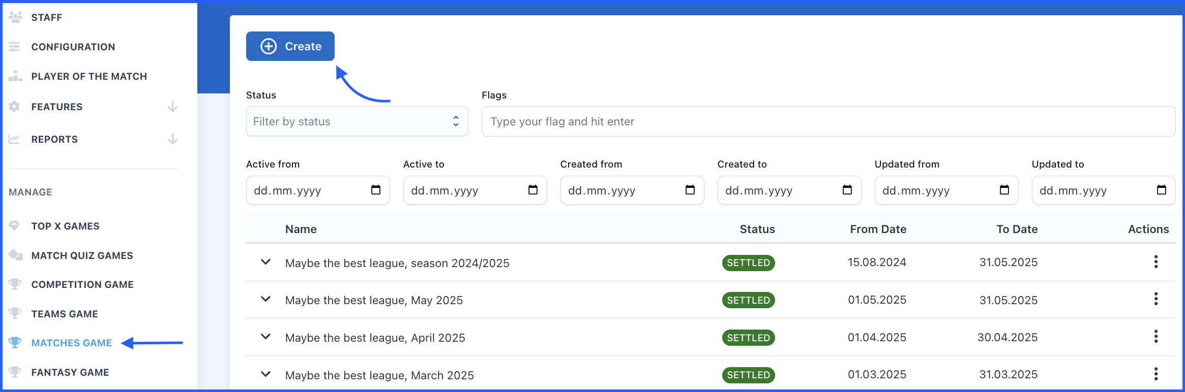 - Click the blue Create button located at the top of the Matches Games management page