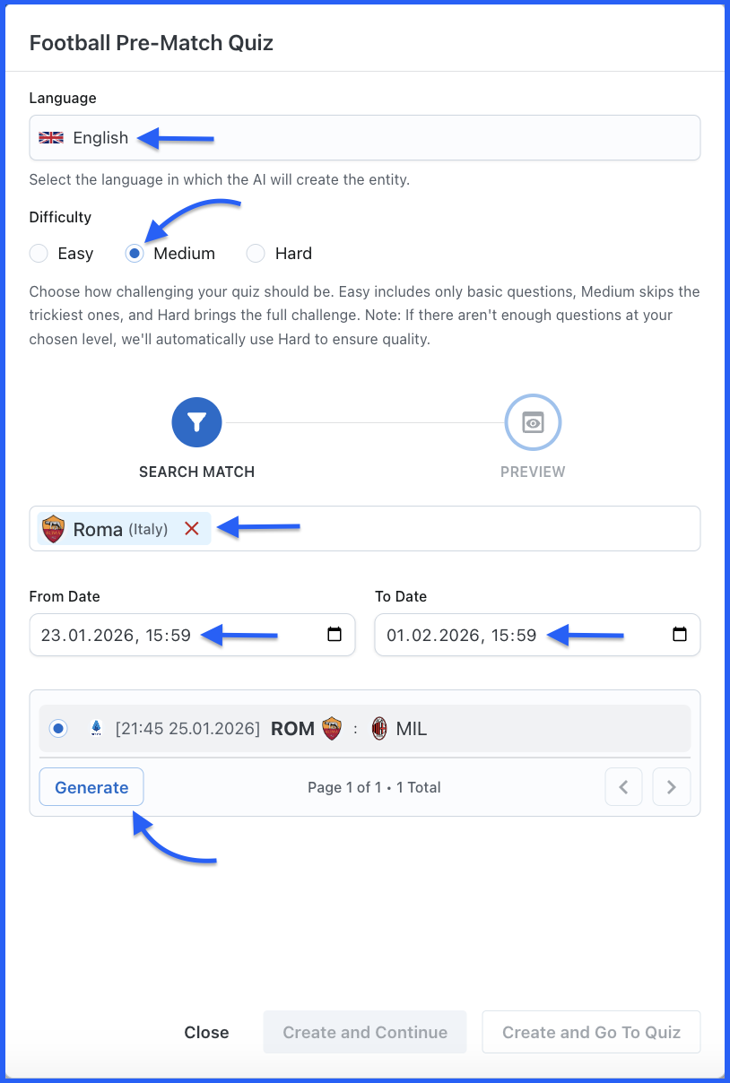 Configure your quiz settings: Select your language from the dropdown, choose the difficulty level, search for a team & set your date range. The system displays all available matches within your criteria. Select the match you want by clicking the radio button next to it. Click the Generate button at the bottom.
