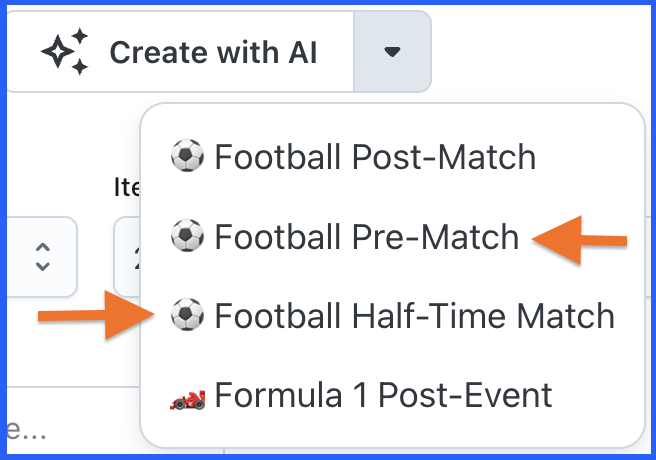 Click the Create with AI button to open the dropdown menu. Select either Football Pre-Match or Football Half-Time Match depending on which quiz type you want to create.