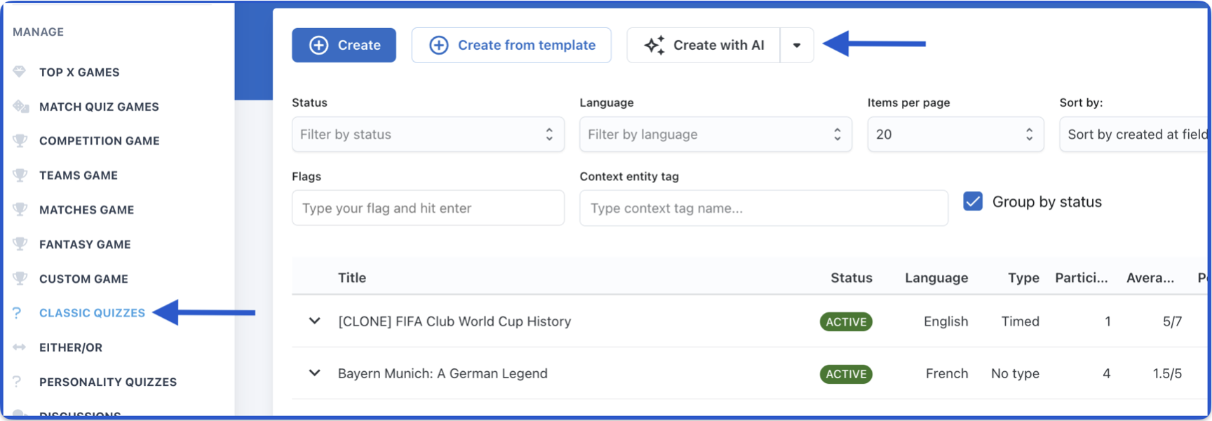 Open your management portal and click on Classic Quizzes in the left sidebar. At the top of the page, locate the Create with AI button.