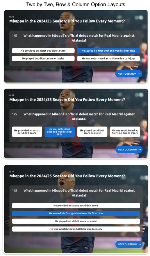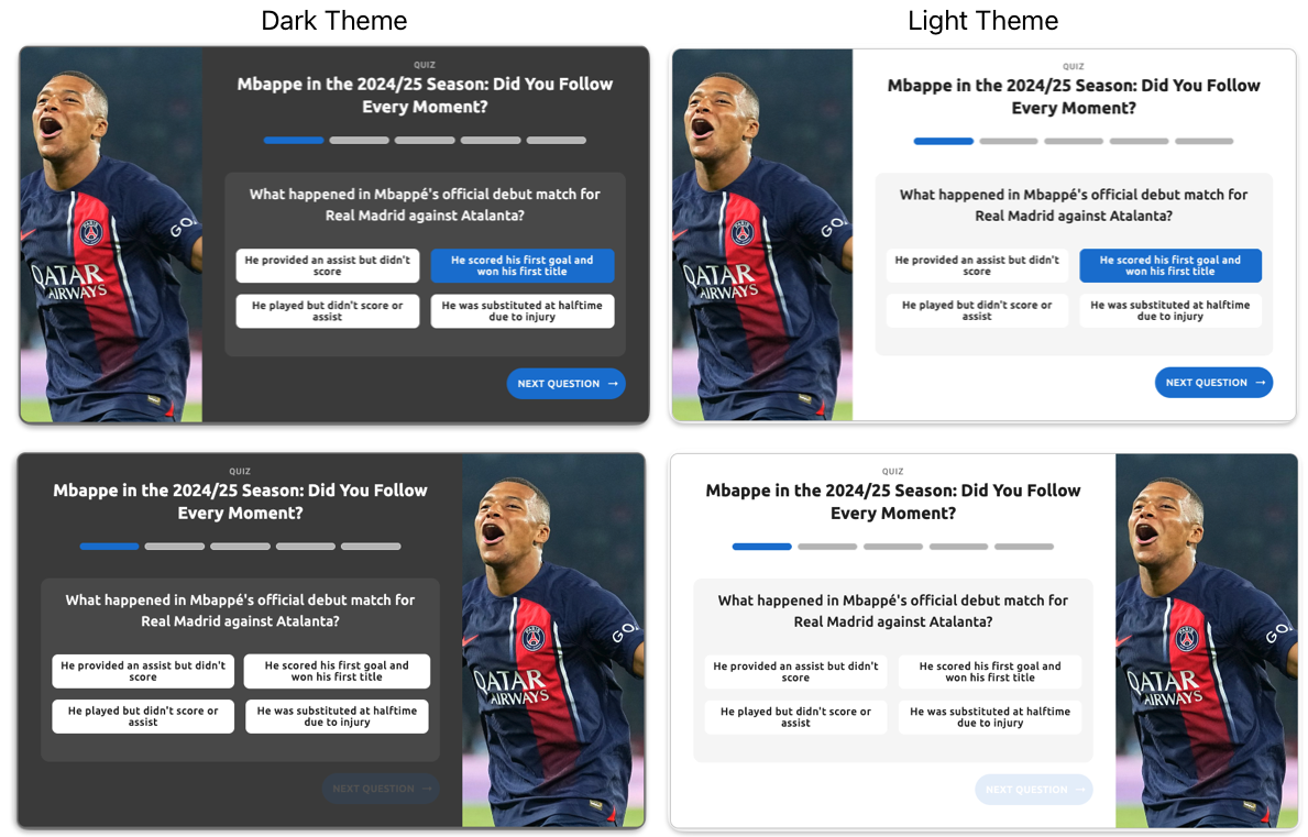 - Standard Quizzes Without images: Dark & Light mode showing all option layouts