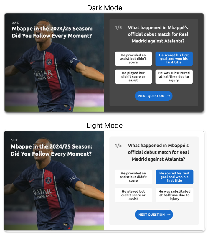 Both generate a div code with the appropriate configuration that you can copy and paste directly into your website. Choose the Management Portal for configuring quiz-specific settings, or use the Storybook to visually preview exactly how your quiz will look with real data before embedding it and going live.