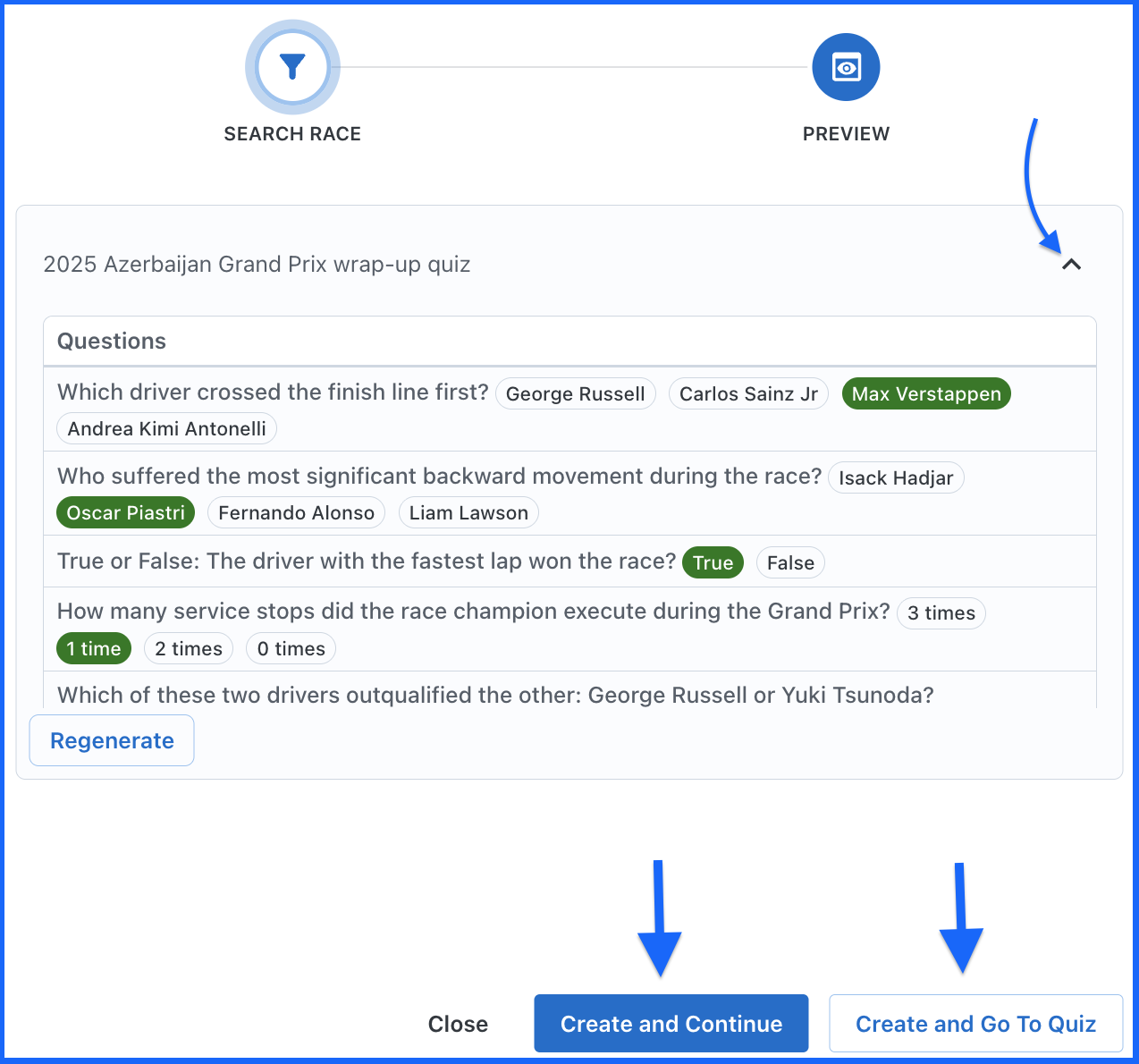 Review the generated quiz title and questions. If you want a quiz with different questions, click Regenerate. When satisfied, click Create and Continue to keep generating more AI quizzes, or Create and Go To Quiz to be redirected to the quiz editing page.
