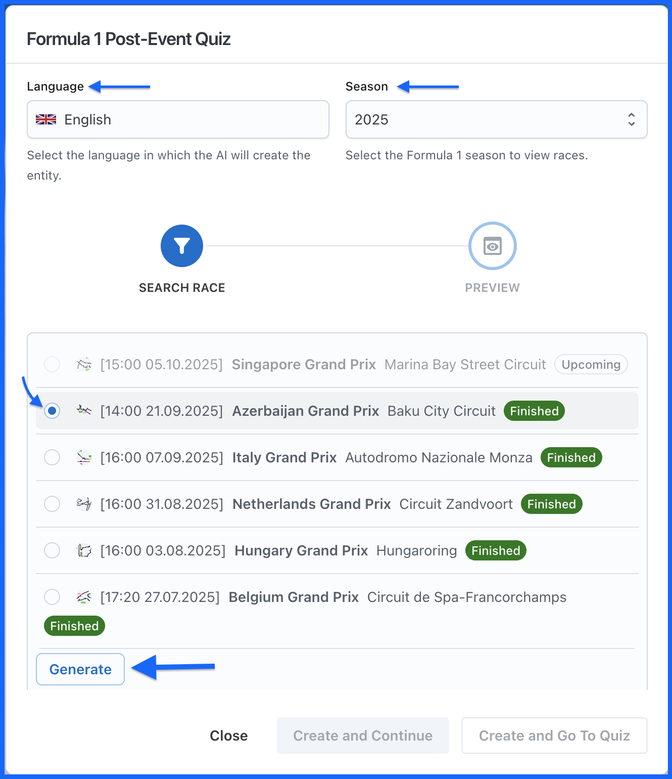 Formula 1 Post-Event AI Quizzes are Classic Quizzes based on real F1 races. The AI pulls actual race data from sports APIs — including finishing positions, fastest laps, pit stops, and qualifying results—and generates relevant questions. This allows you to publish timely, engaging quiz content immediately after races end without manually writing questions. Simply select a race, click generate, and your quiz is ready in seconds.