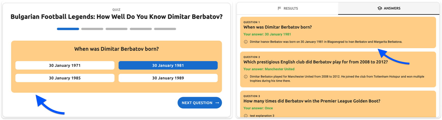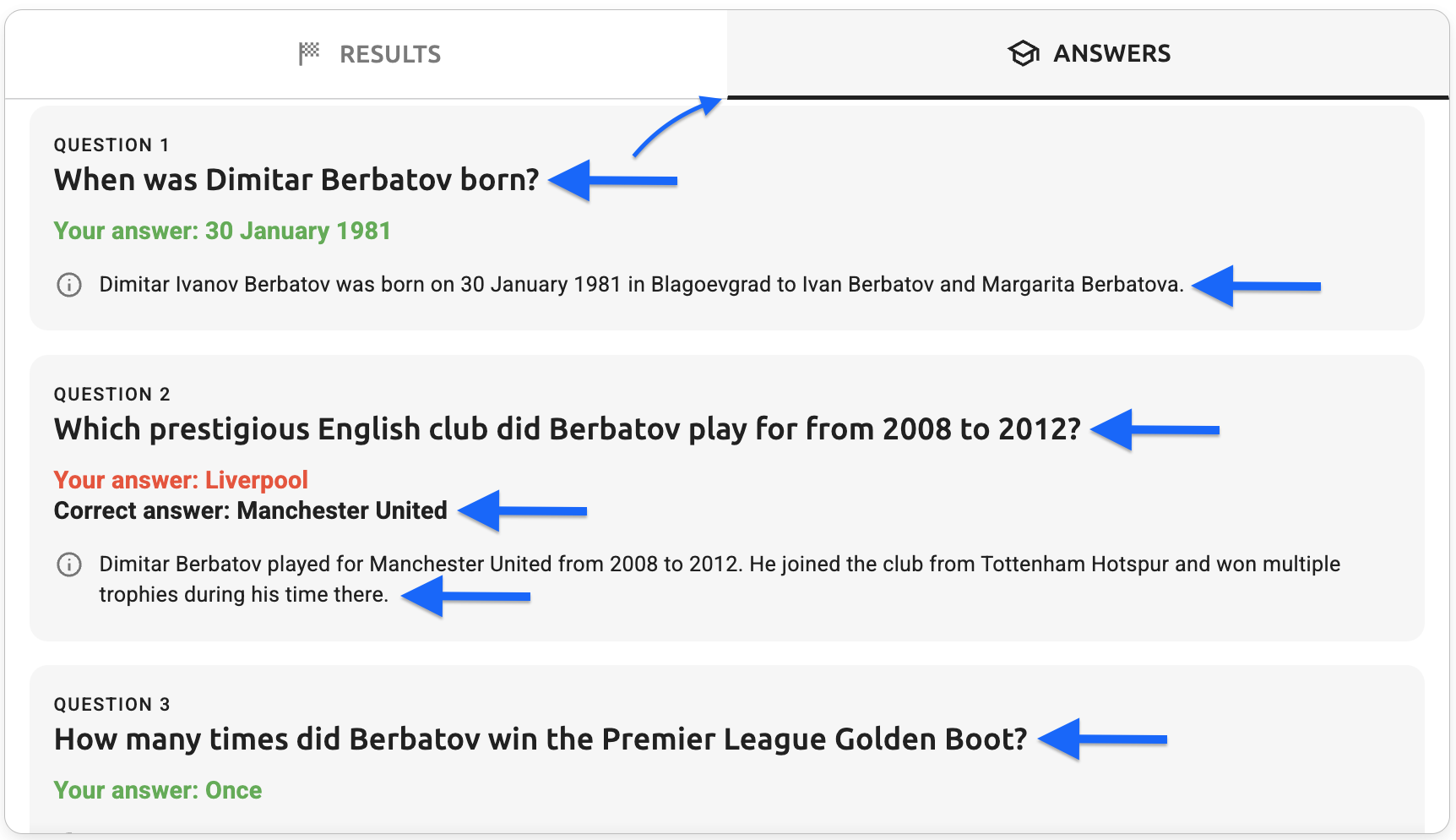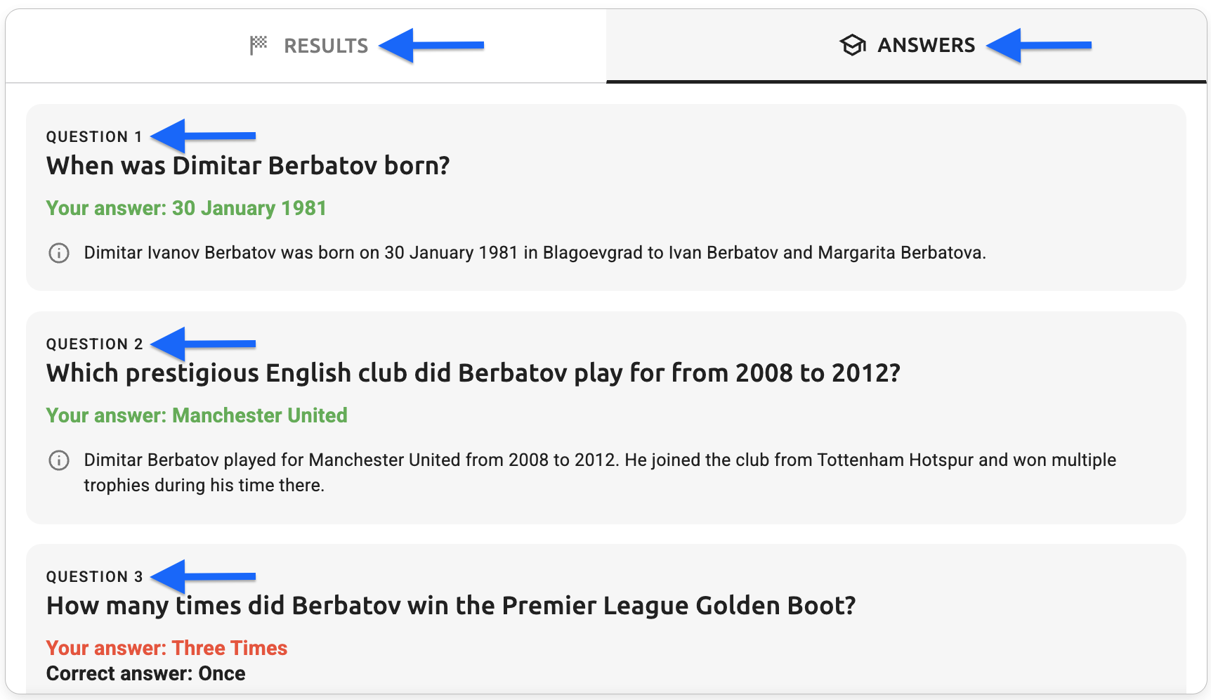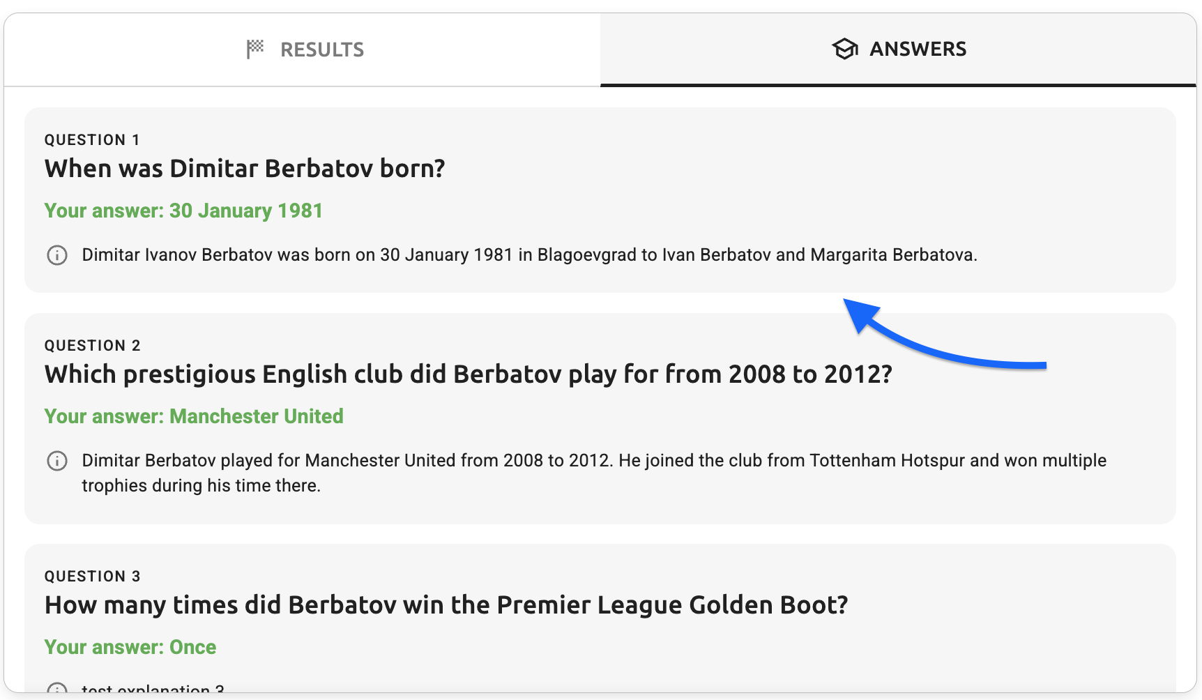 - Answers tab - explanation text - The question explanation text (e.g., "Dimitar Ivanov Berbatov was born on 30 January 1981 in Blagoevgrad to Ivan Berbatov and Margarita Berbatova")