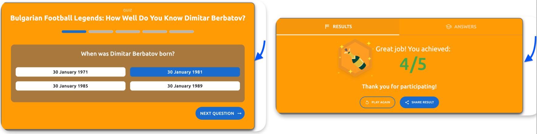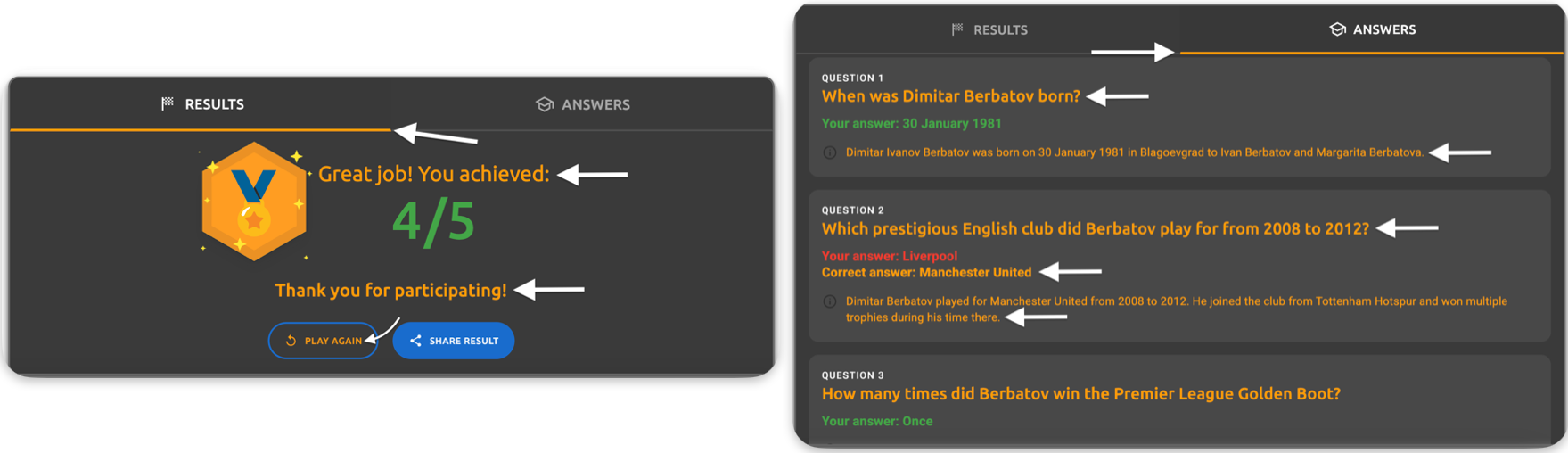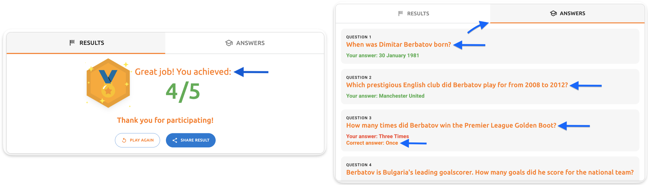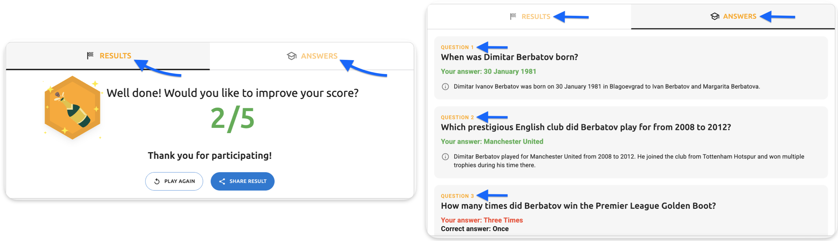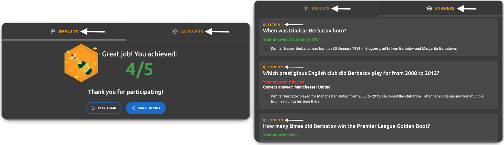 - Answers tab - explanation text - The question explanation text (e.g., "Dimitar Ivanov Berbatov was born on 30 January 1981 in Blagoevgrad to Ivan Berbatov and Margarita Berbatova")