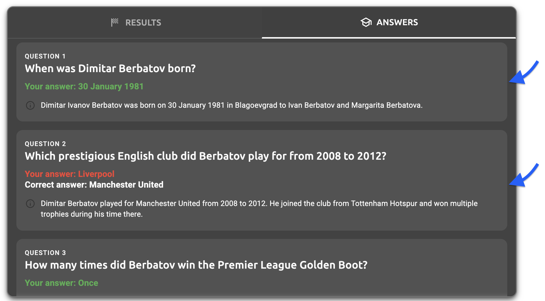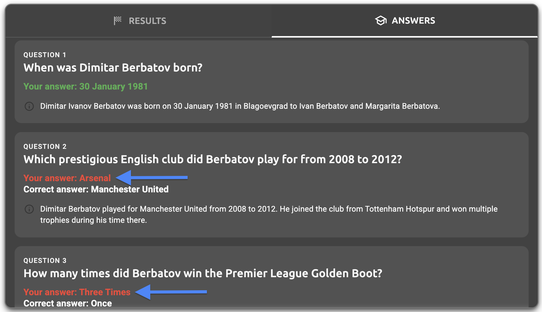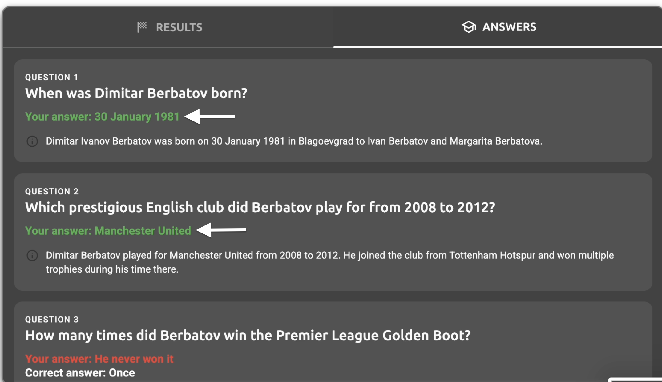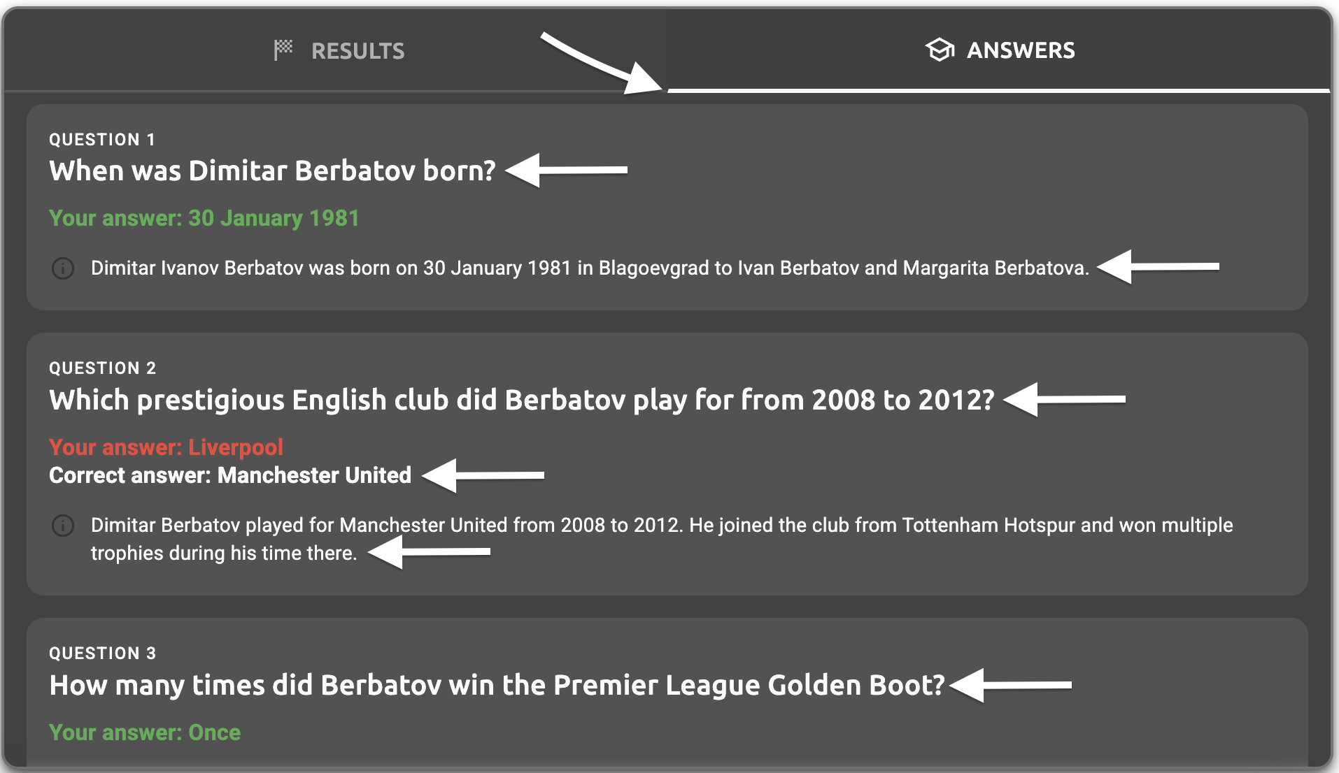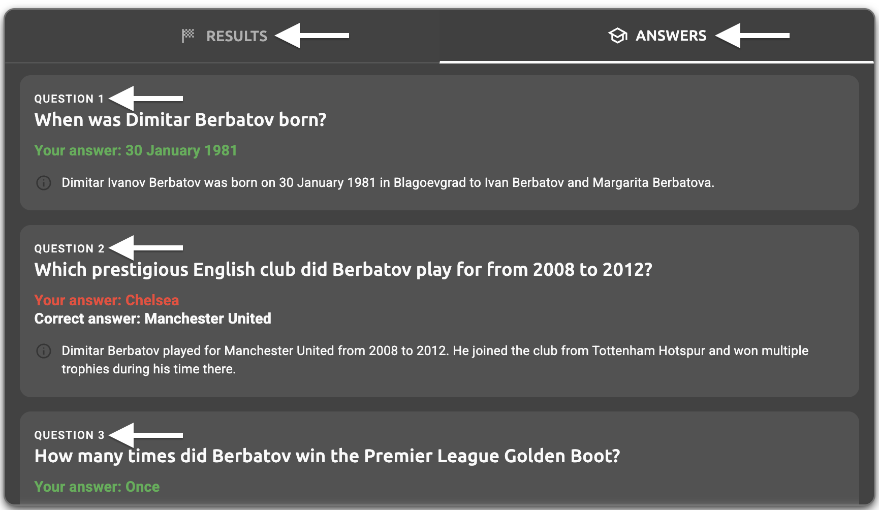 - Answers tab question text - The question text displayed in the answers tab (e.g., "When was Dimitar Berbatov born?", "Which prestigious English club did Berbatov play for from 2008 to 2012?")