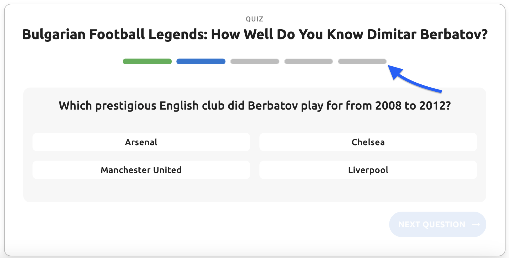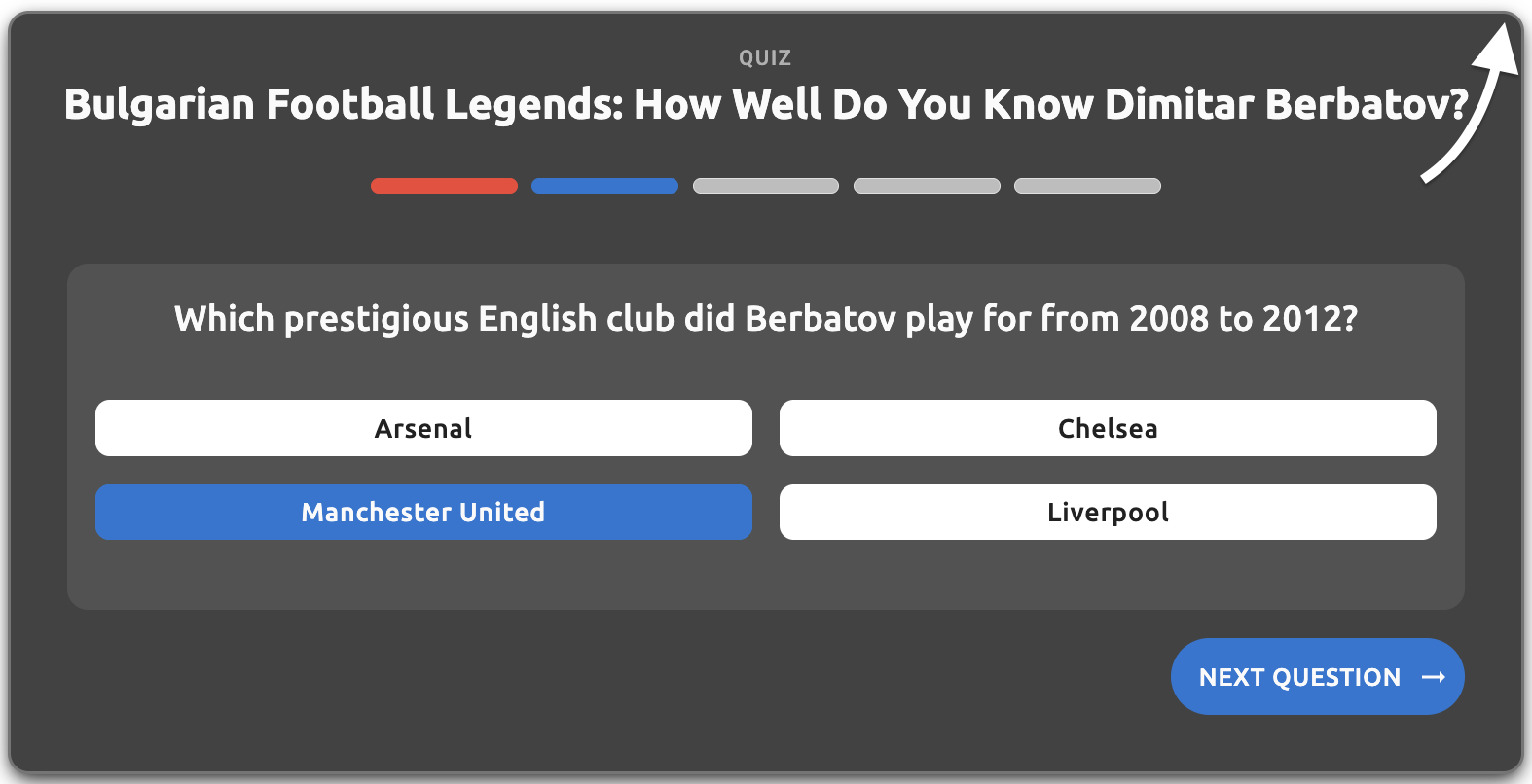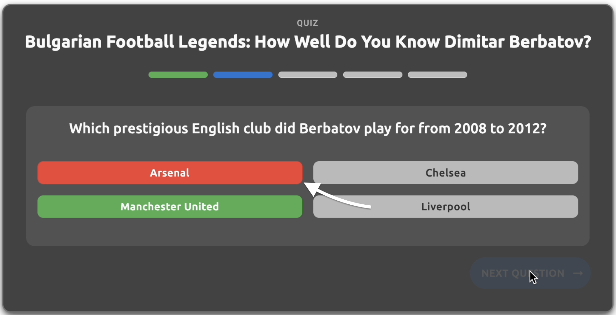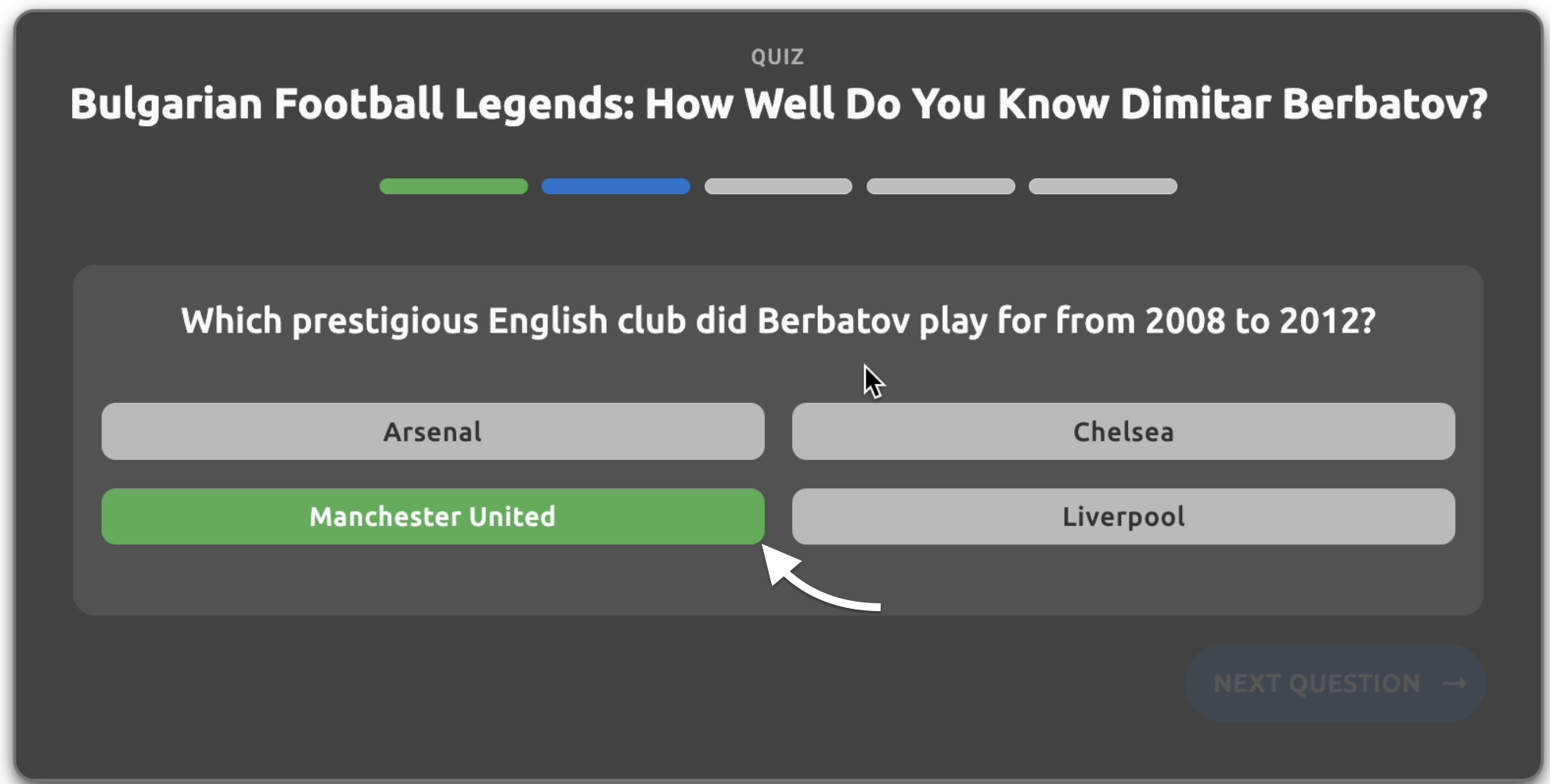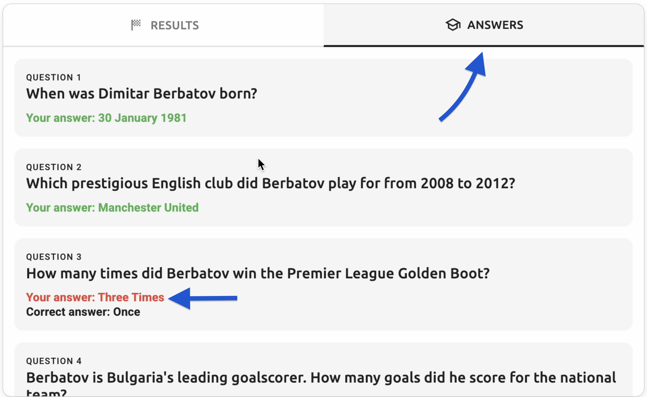 - Answers tab question text - The question text displayed in the answers tab (e.g., "When was Dimitar Berbatov born?", "Which prestigious English club did Berbatov play for from 2008 to 2012?")