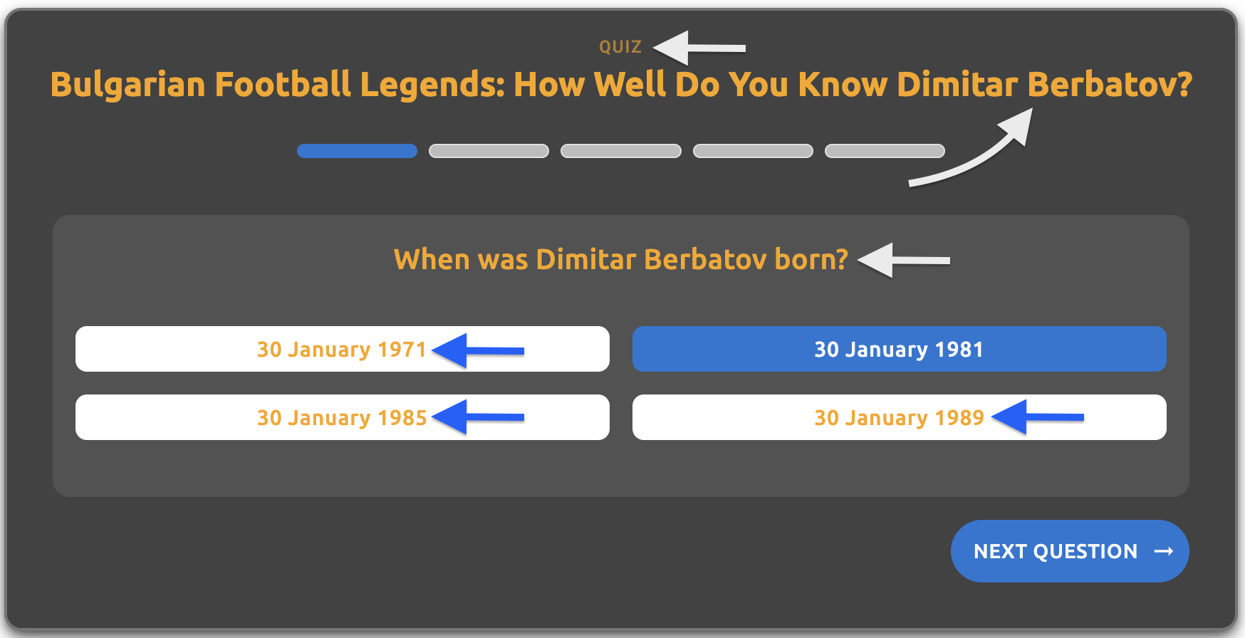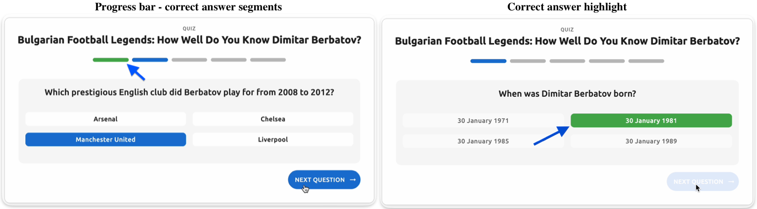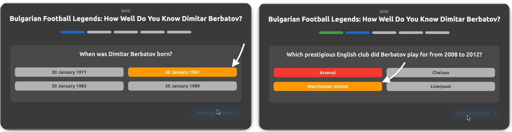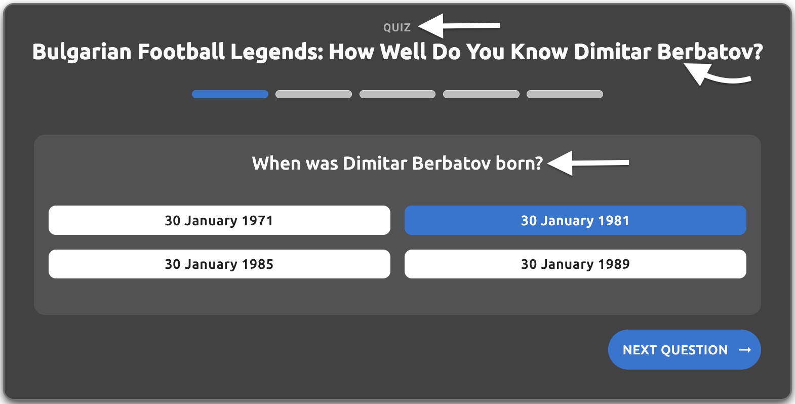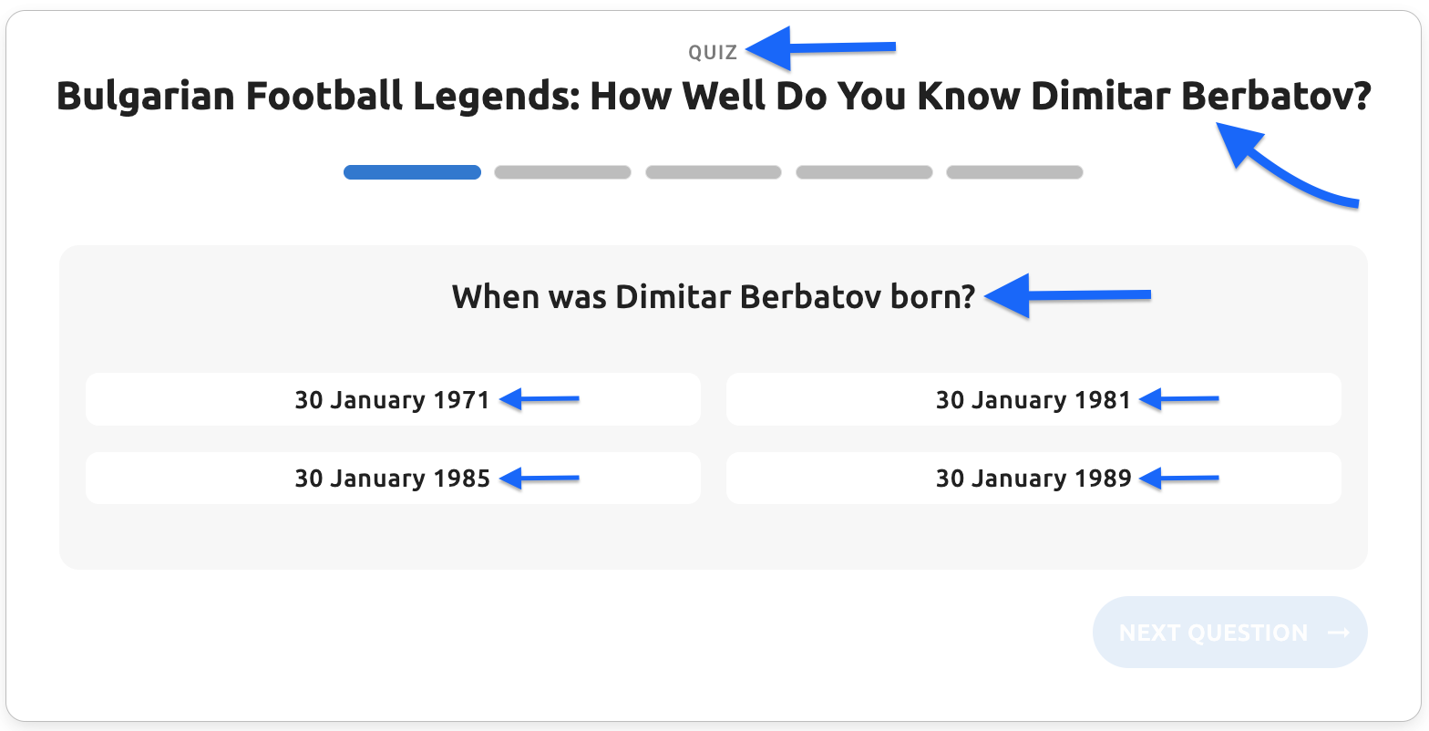 - Question text - The main question text displayed to users (e.g., "When was Dimitar Berbatov born?")