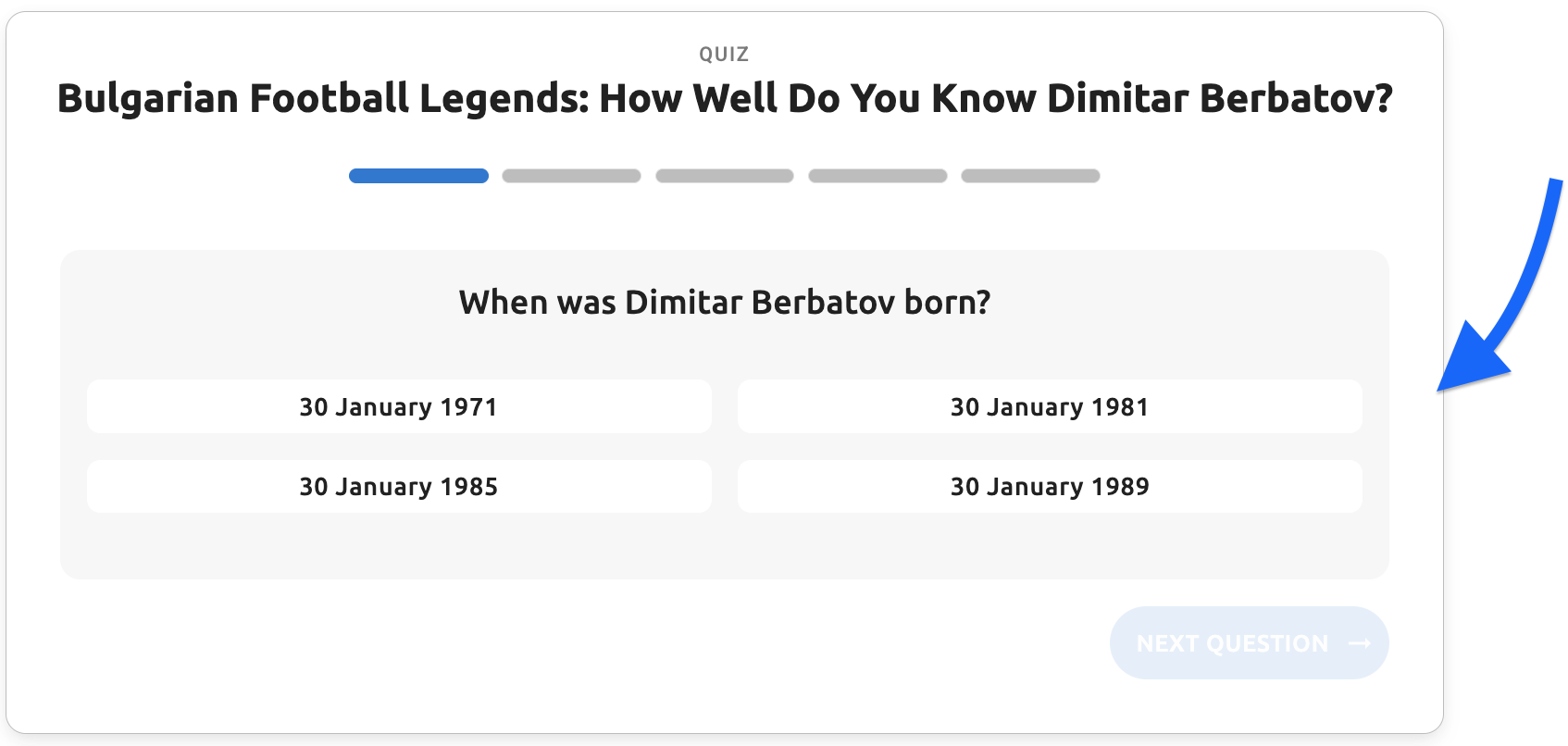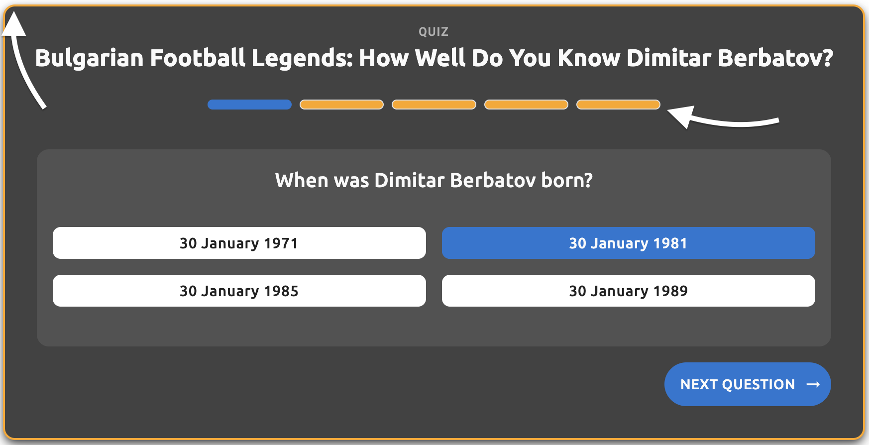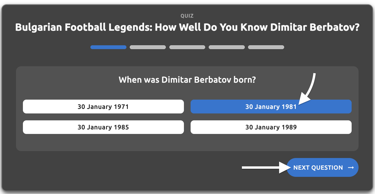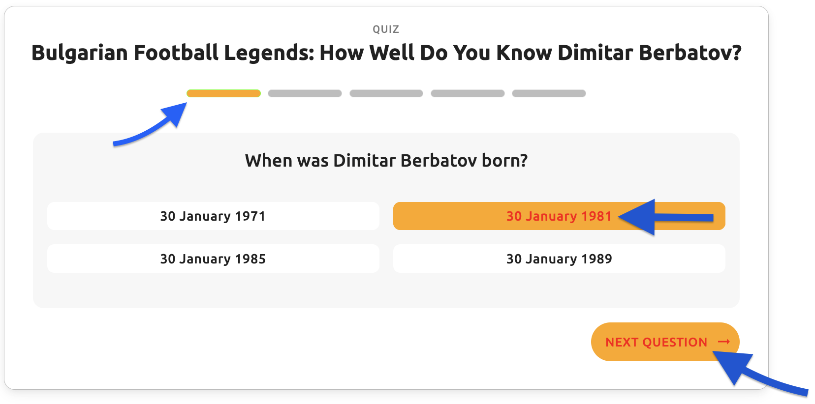 - Question text - The main question text displayed to users (e.g., "When was Dimitar Berbatov born?")