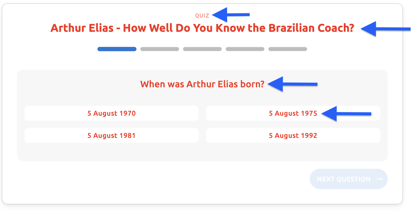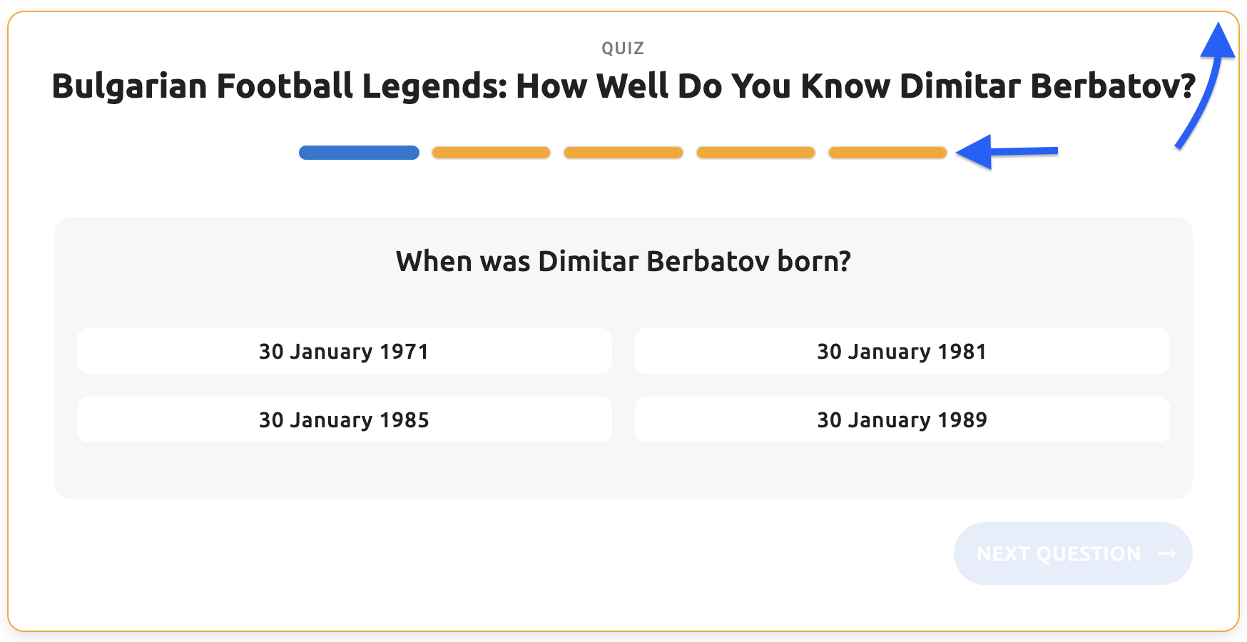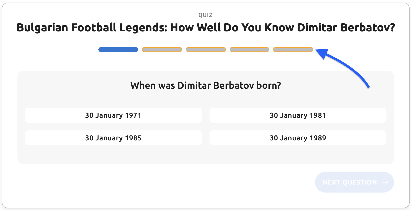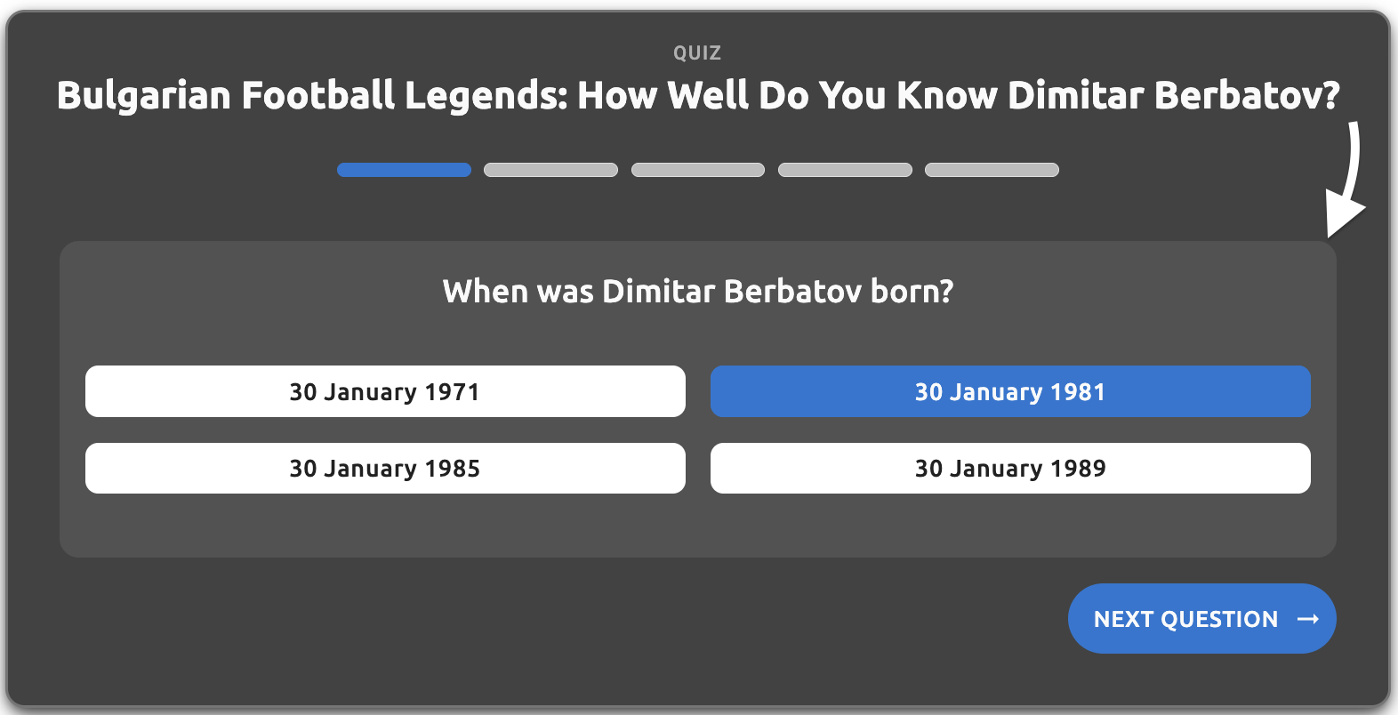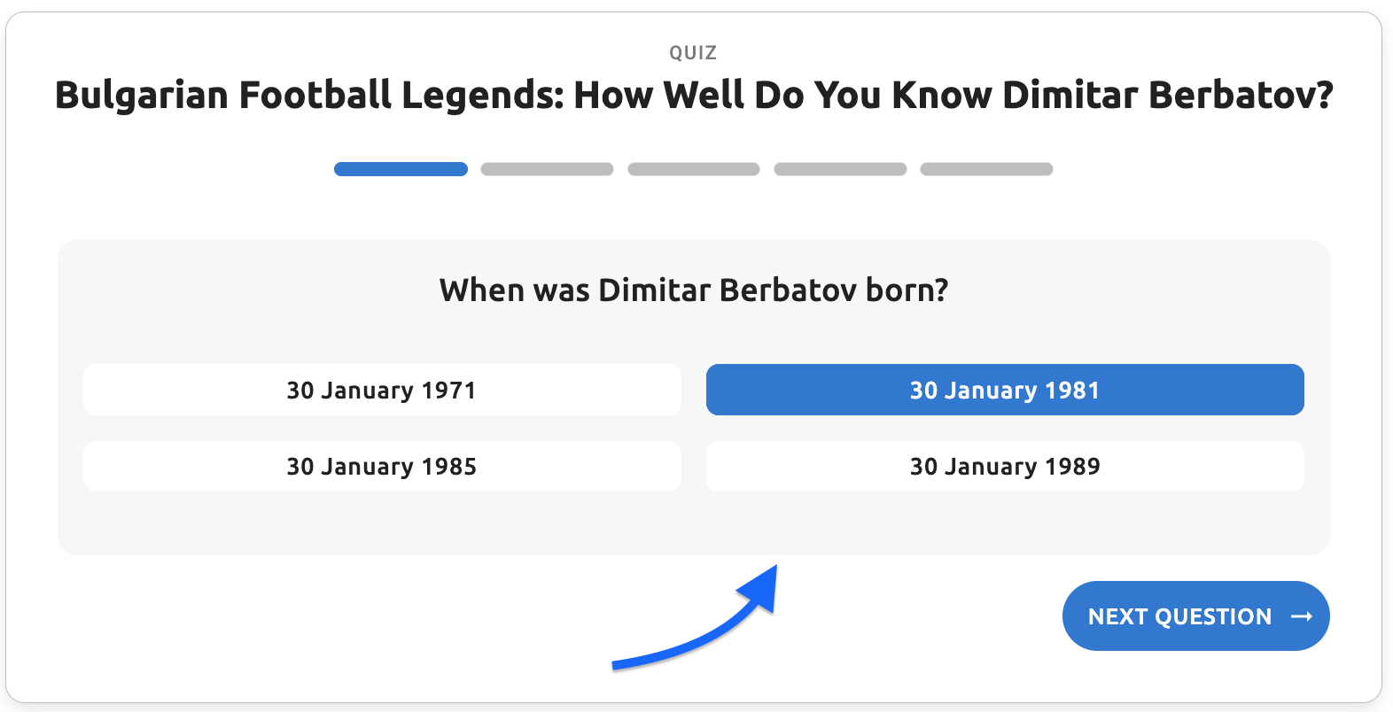 - Question text - The main question text displayed to users (e.g., "When was Dimitar Berbatov born?")