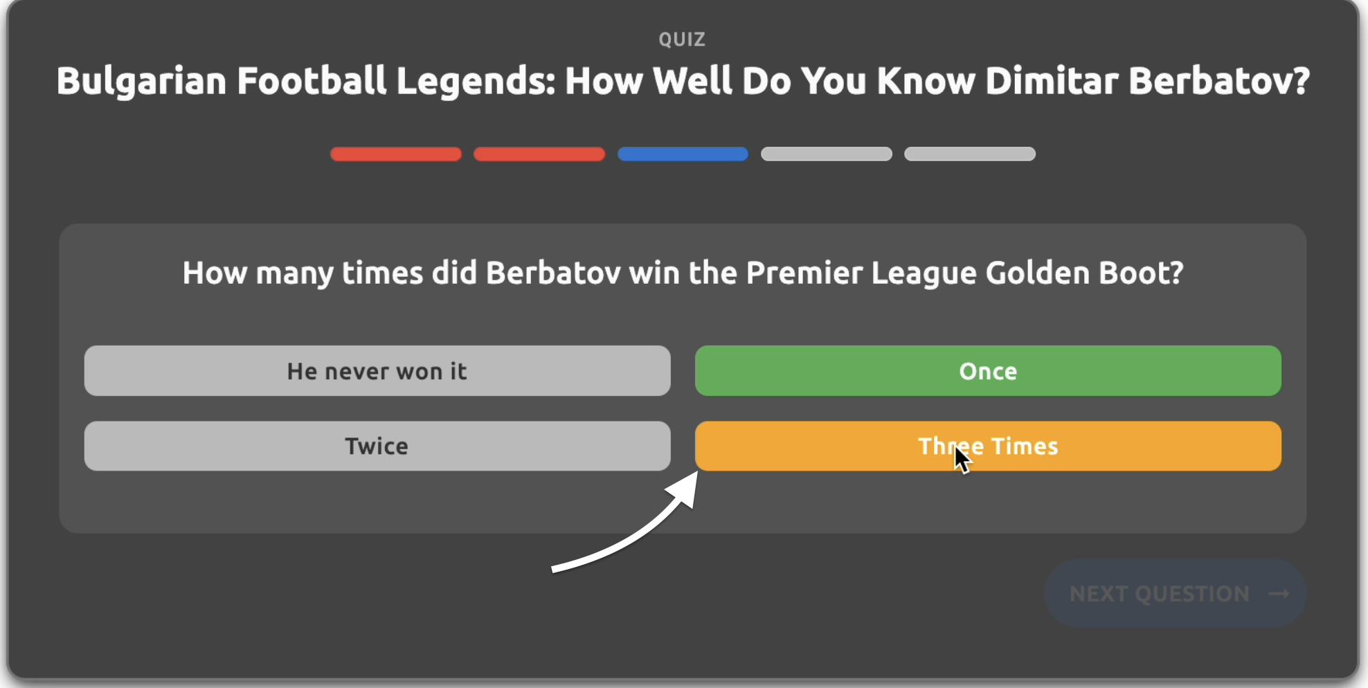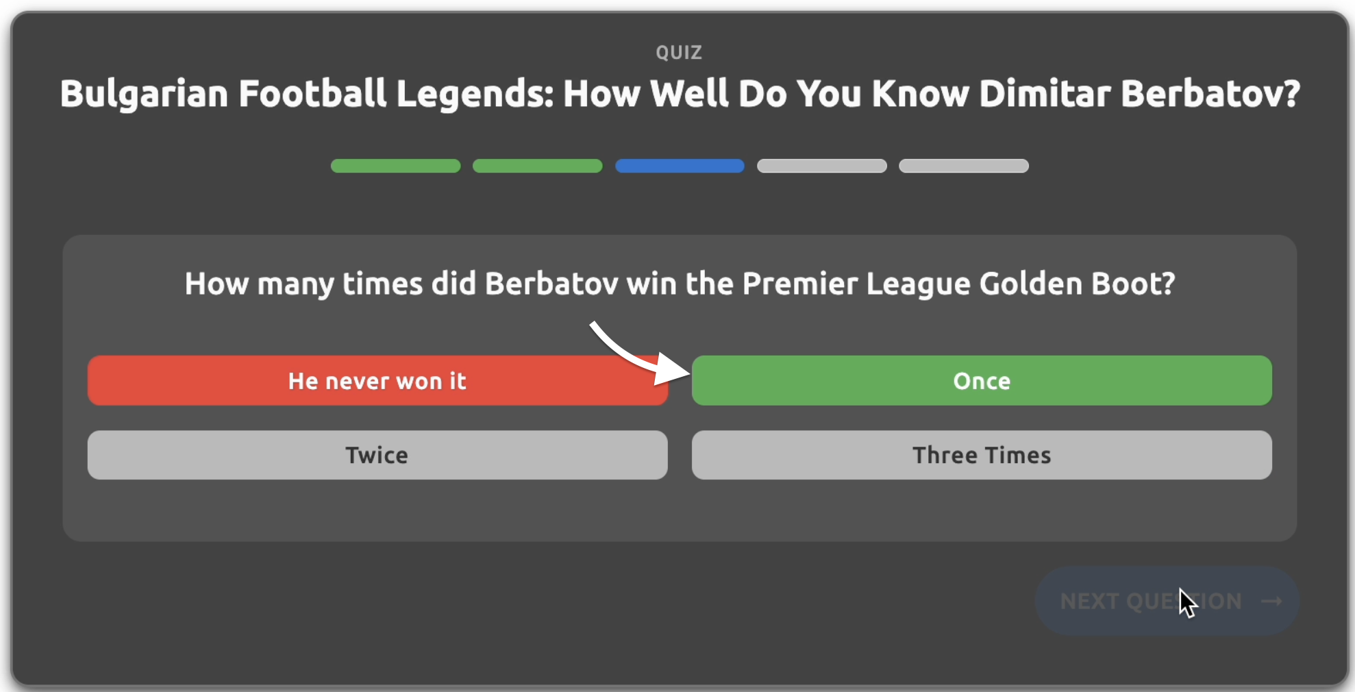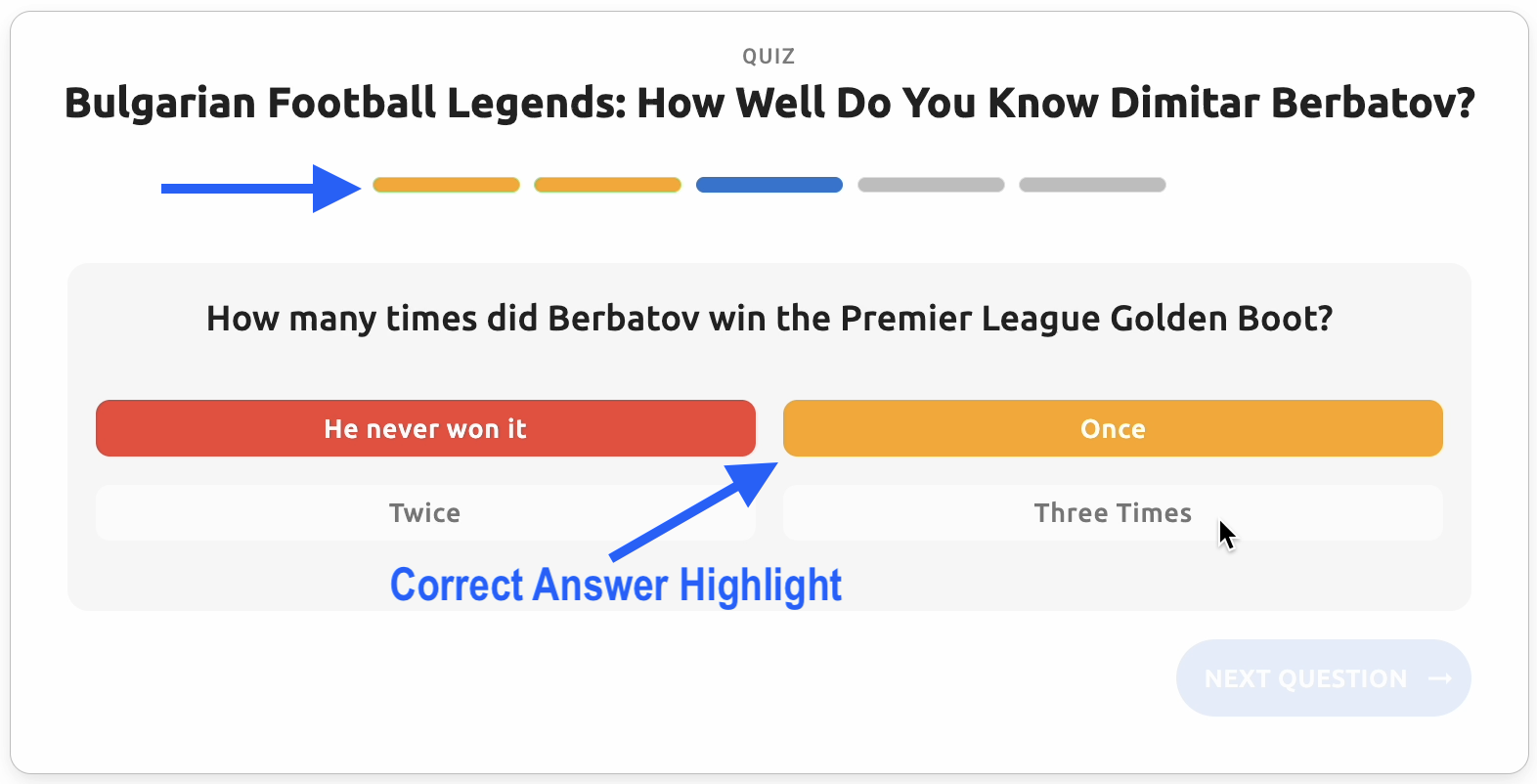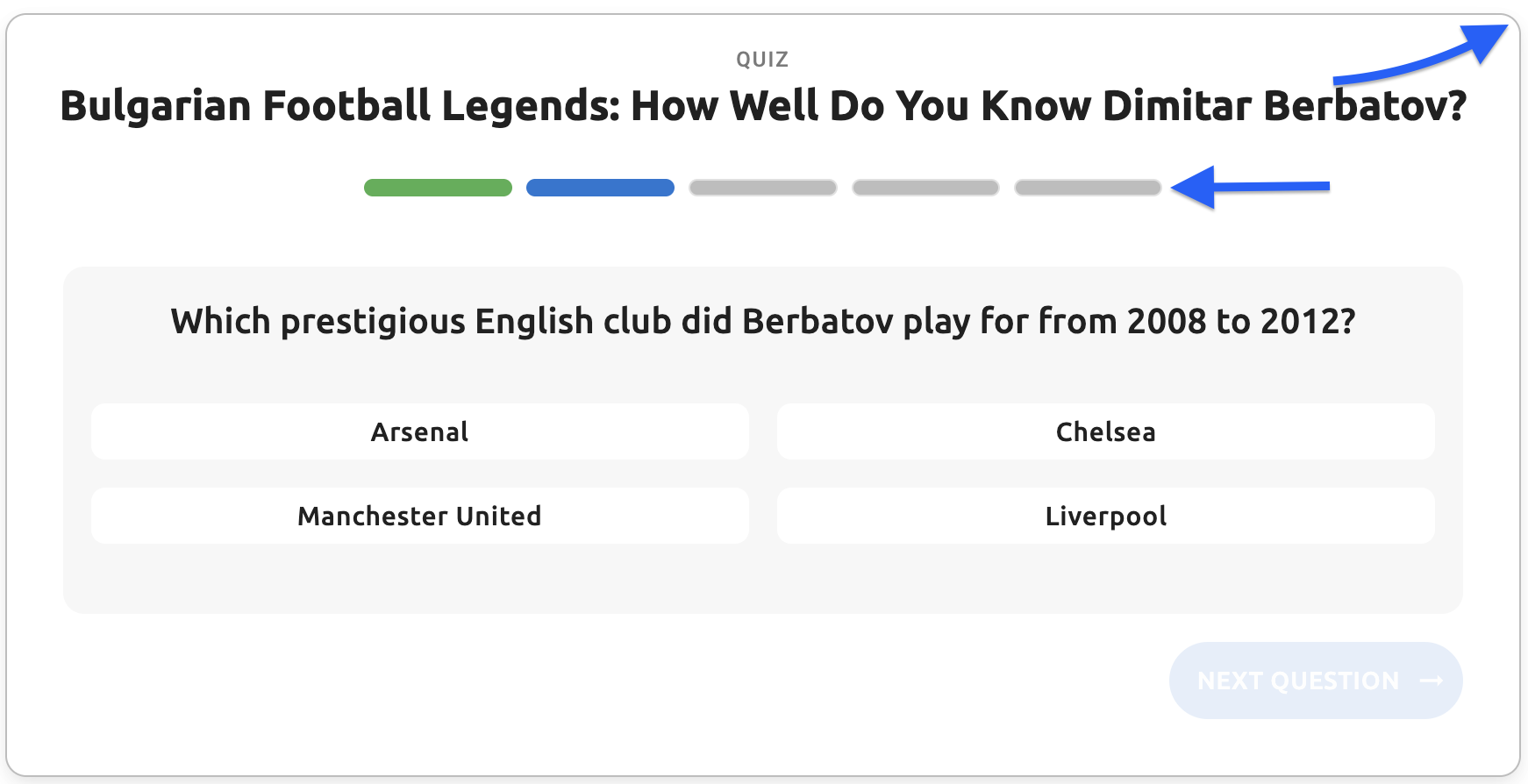 - Question text - The main question text displayed to users (e.g., "When was Dimitar Berbatov born?")