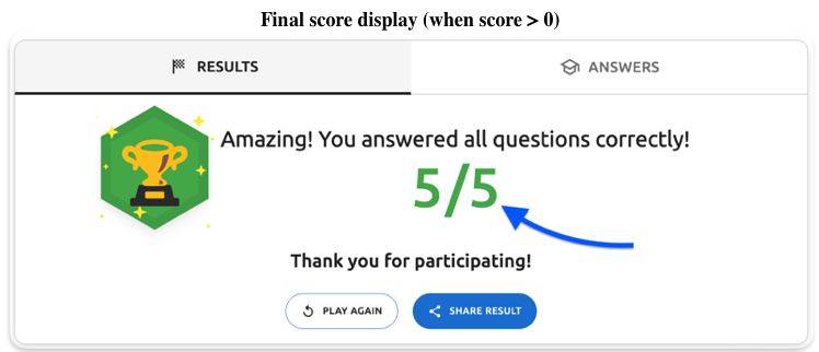 - Final score display (when score > 0) - The score text (e.g., "5/5", "3/5") on the results screen when the user has at least one correct answer