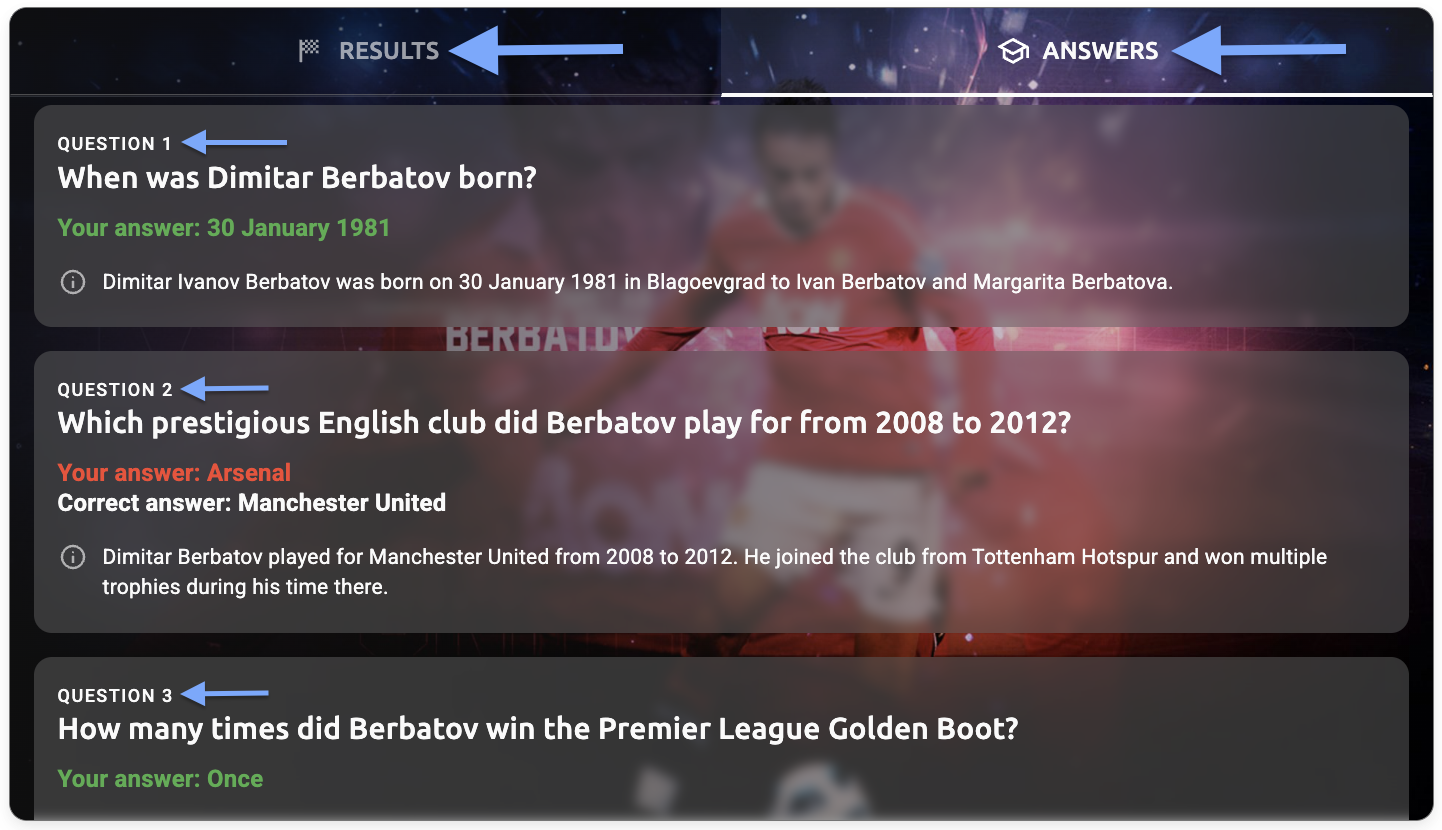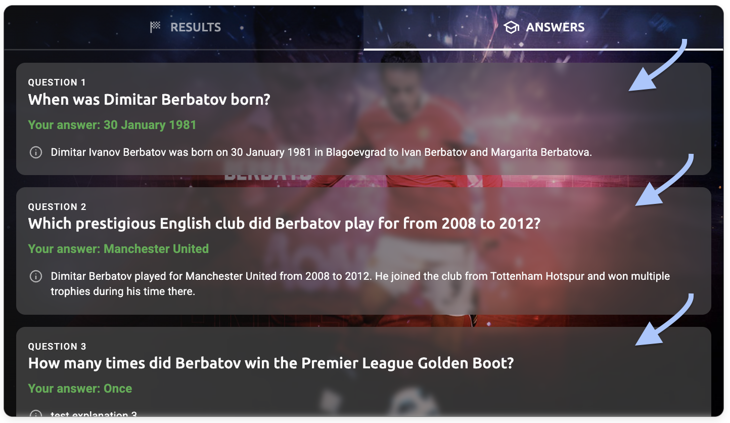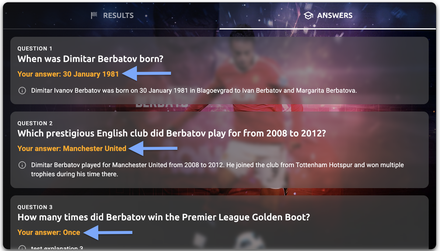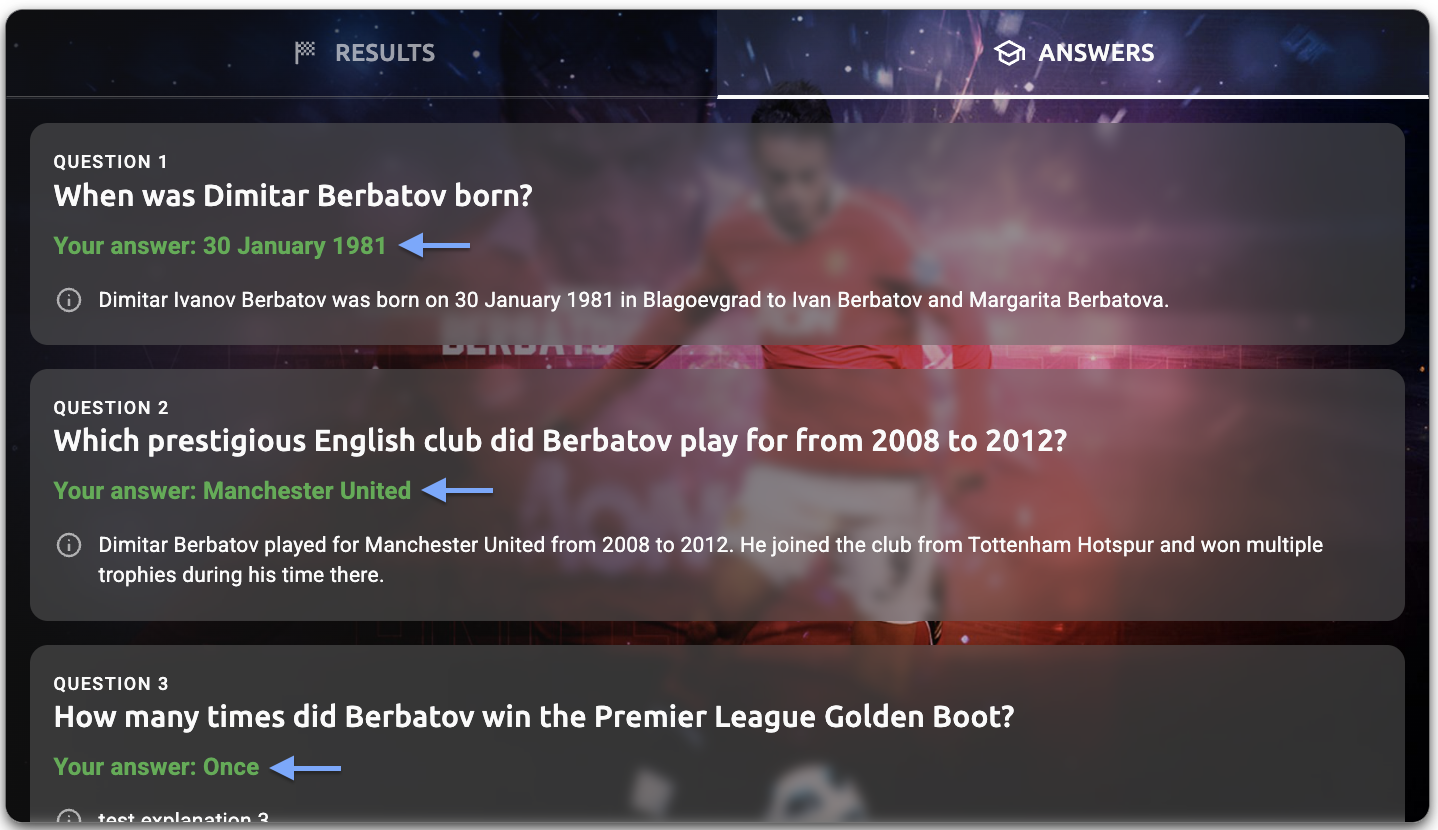 - Answers tab - explanation text - The question explanation text (e.g., "Dimitar Ivanov Berbatov was born on 30 January 1981 in Blagoevgrad to Ivan Berbatov and Margarita Berbatova")
