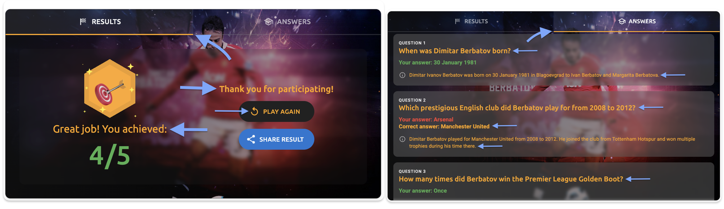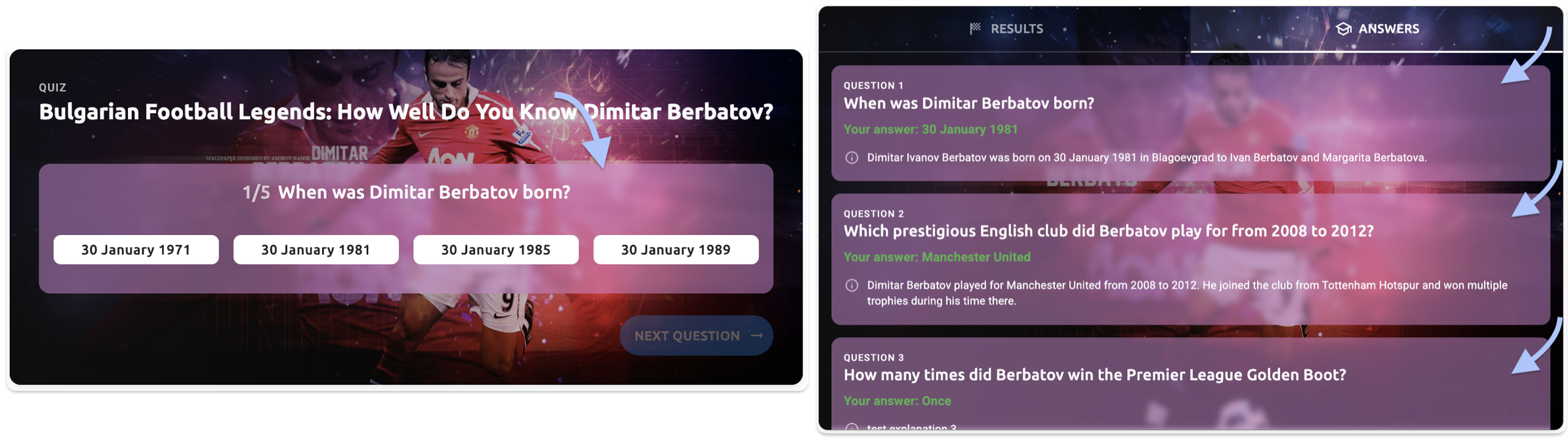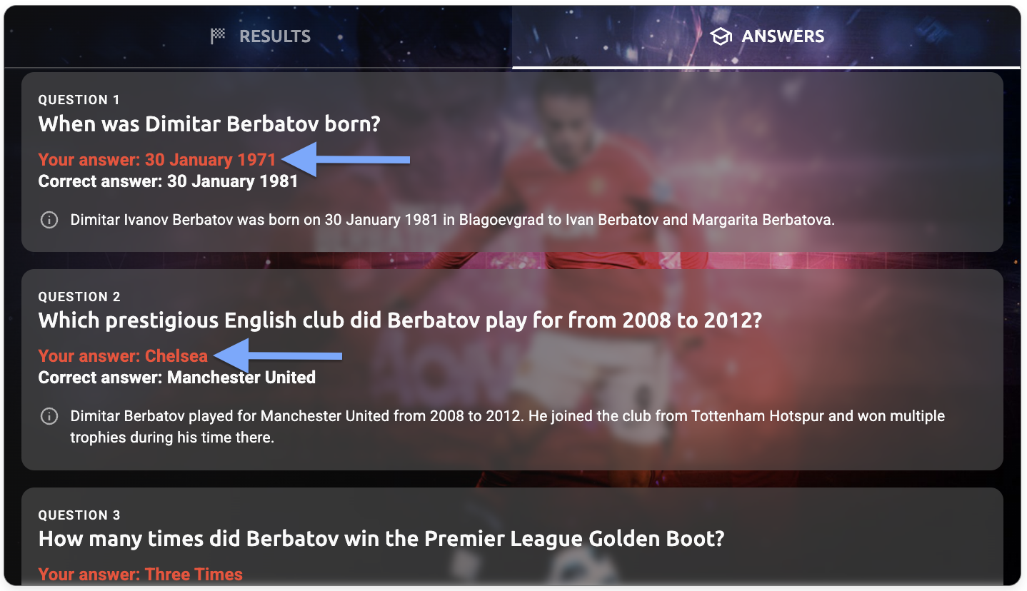 - Answers tab - explanation text - The question explanation text (e.g., "Dimitar Ivanov Berbatov was born on 30 January 1981 in Blagoevgrad to Ivan Berbatov and Margarita Berbatova")