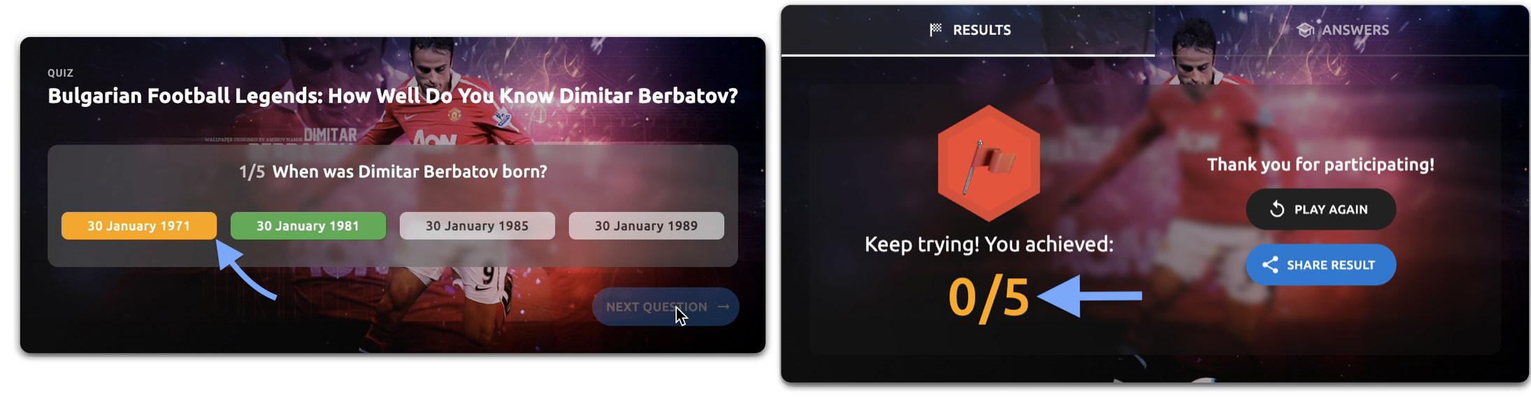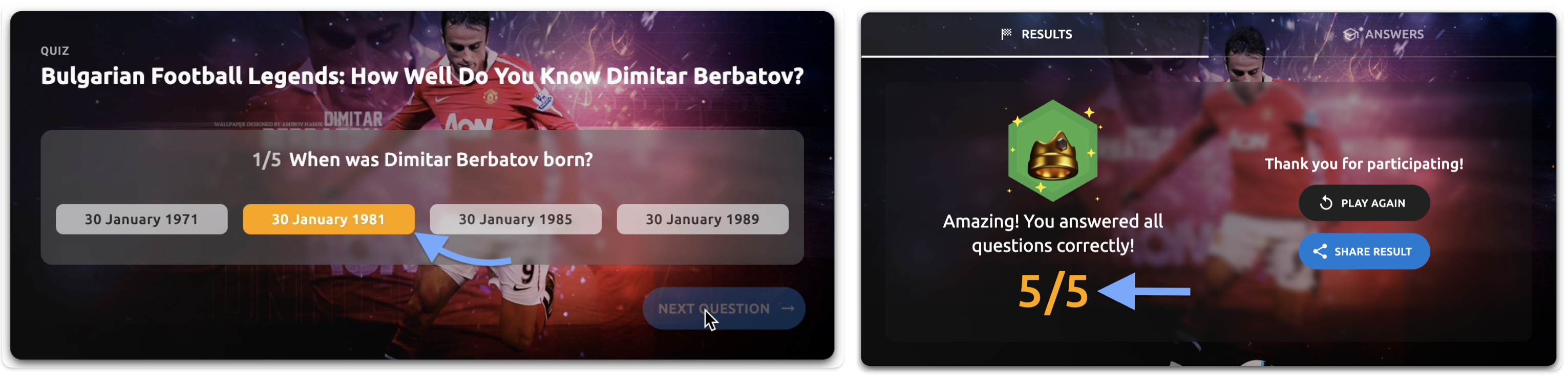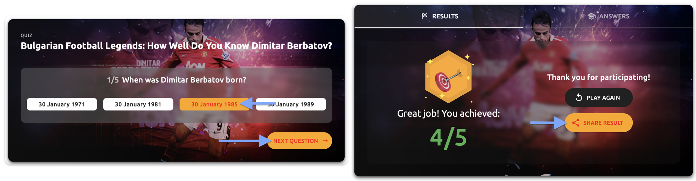 - Quiz title - The primary title text of your quiz (e.g., "Bulgarian Football Legends: How Well Do You Know Dimitar Berbatov?")