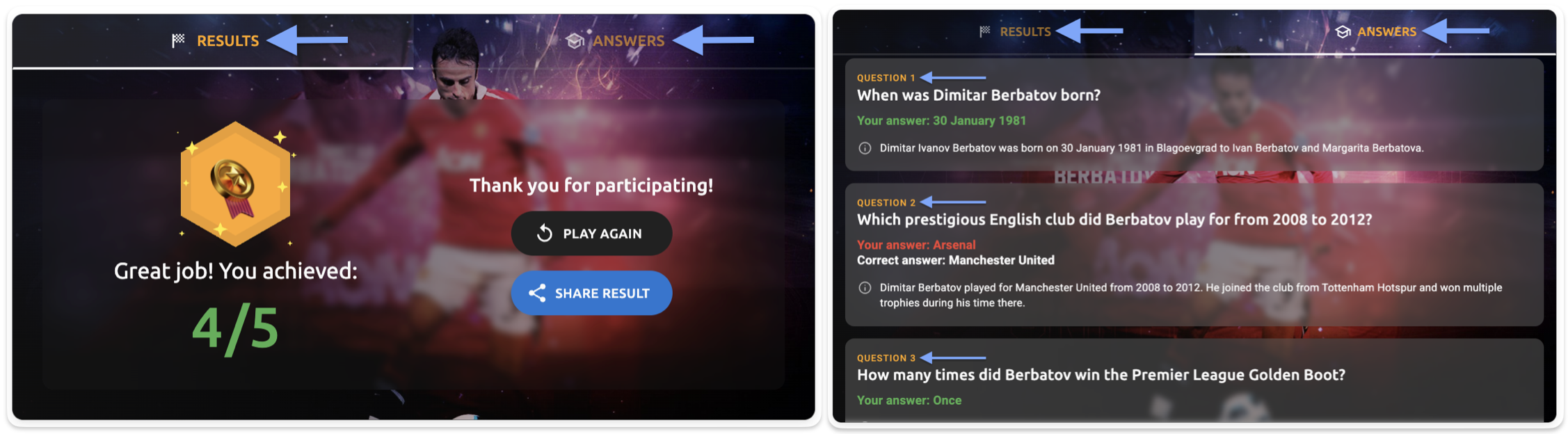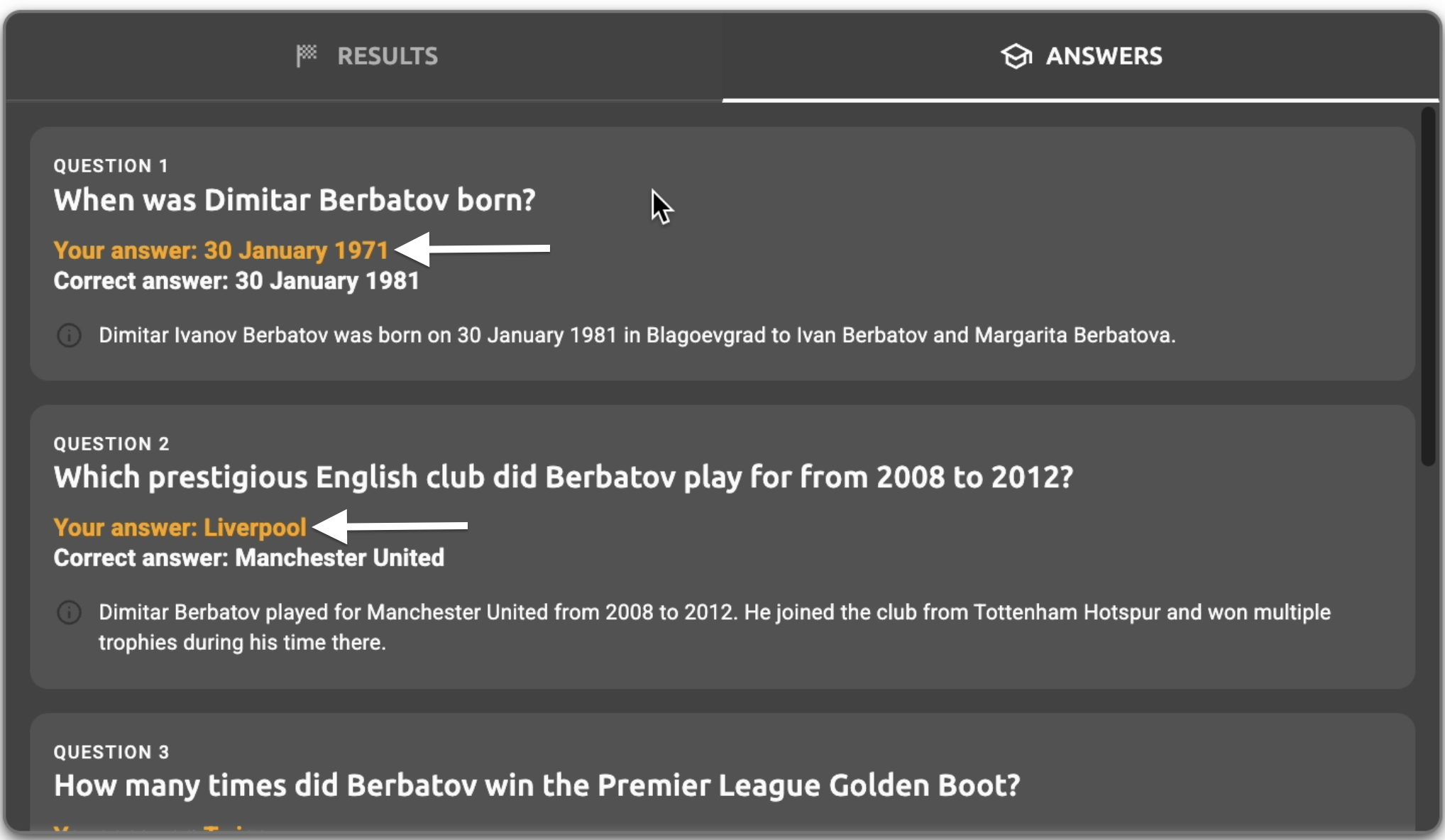 - Answers tab question text - The question text displayed in the answers tab (e.g., "When was Dimitar Berbatov born?", "Which prestigious English club did Berbatov play for from 2008 to 2012?")