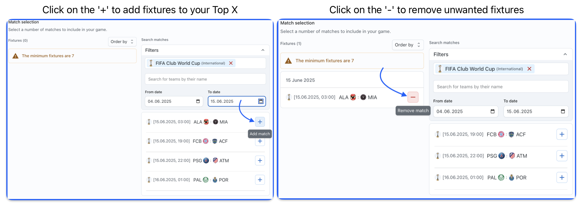 Match Selection - A critical field requiring at least one match to be selected. Maximum & Minimum match limits depend on global Top X configurations. Select matches by typing competition/team names in the 'Search matches' field, choosing from the dropdown, and picking specific fixture/s. Filtering options include competitions, teams, and date ranges.